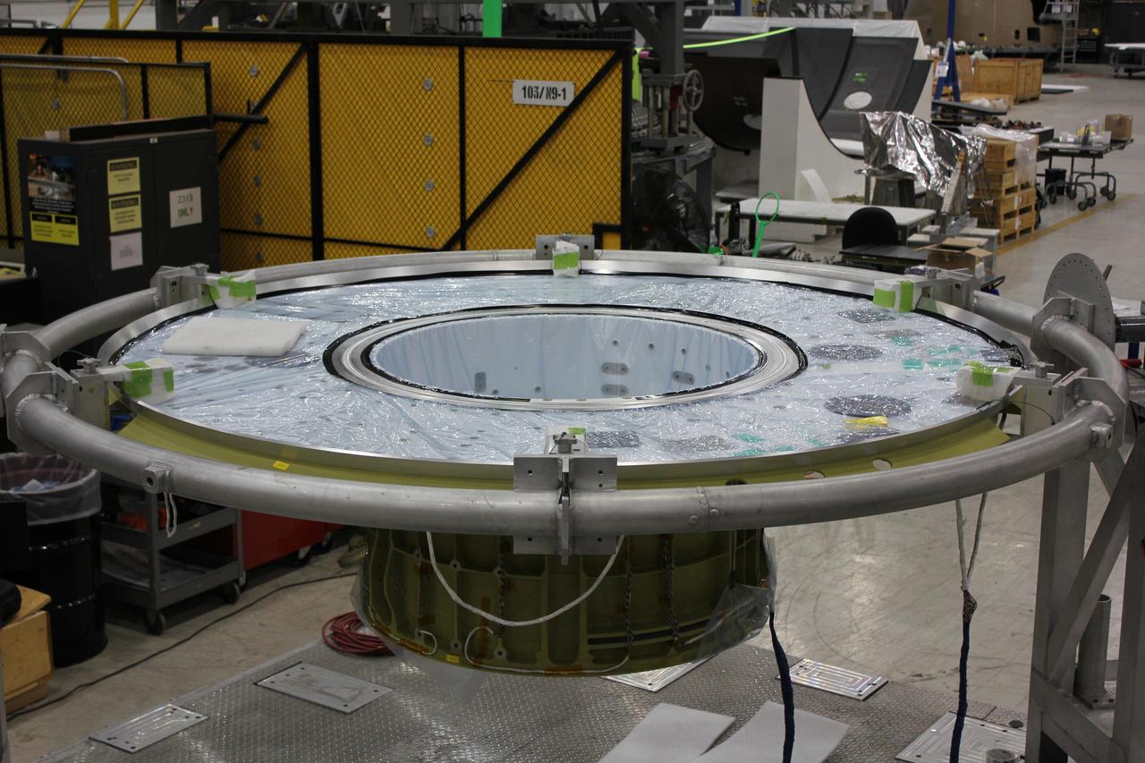 At NASA's Michoud Assembly Facility in Louisiana, Lockheed Martin technicians complete the first weld on the pressure vessel for Orion which will carry humans to deep space on Artemis II on Dec. 21, 2017.