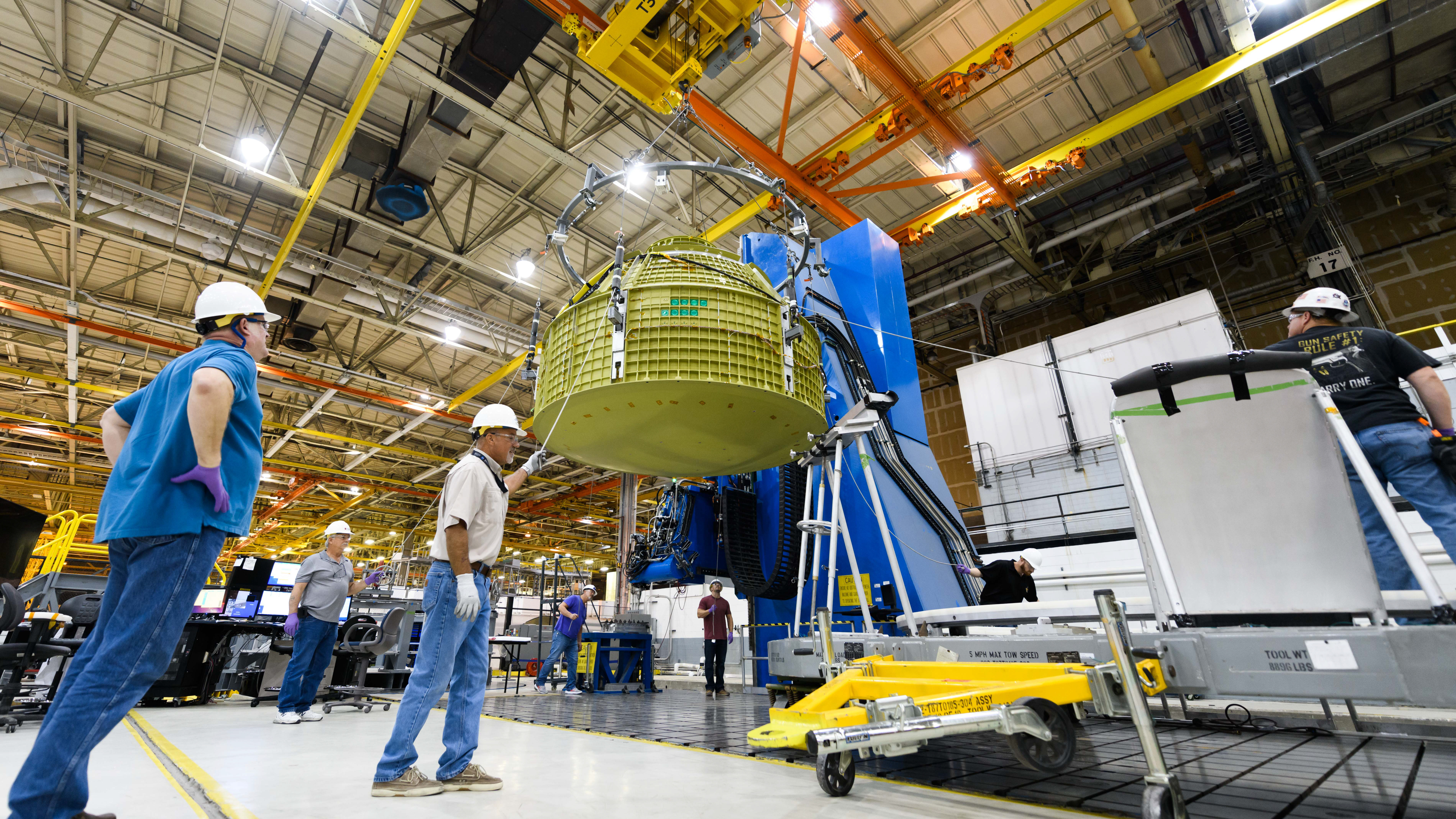 Lockheed Martin technicians at NASA's Michoud Assembly Facility in New Orleans, Louisiana, complete the final weld on the pressure vessel of the Orion crew module for Artemis II on July 24, 2018, the first flight of Orion with astronauts which will carry them farther into the solar system than ever before.