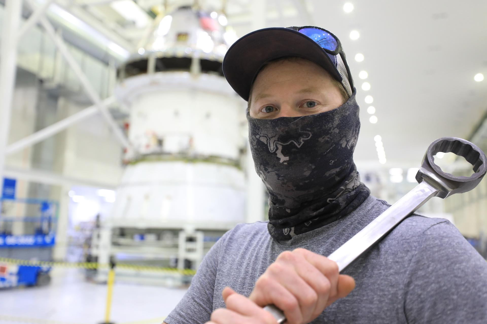 ASRC technician Chris Slack assists with the installation of the spacecraft adapter (SA) cone to the Artemis I Orion spacecraft inside the Neil Armstrong Operations and Checkout Building at NASA’s Kennedy Space Center on Aug. 10, 2020. This is one of the final major hardware operations the spacecraft will undergo during closeout processing prior to being integrated with the Space Launch System (SLS) rocket in preparation for the first Artemis mission. The spacecraft adapter cone connects the bottom portion of Orion’s service module to the top part of the rocket known as the interim cryogenic propulsion stage (ICPS). Orion will fly on the agency’s Artemis I mission – the first in a series of increasingly complex missions to the Moon that will ultimately lead to the exploration of Mars.