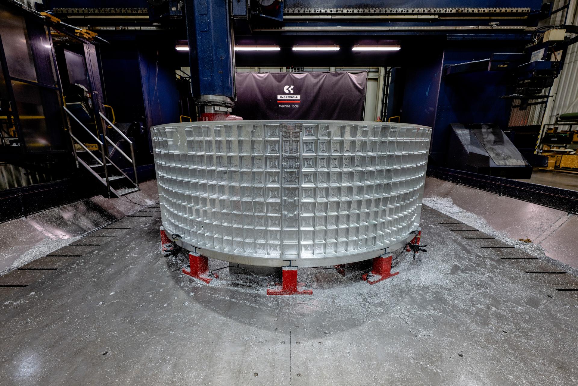 Machining of the tunnel, aft bulkhead, and barrel for the Artemis III Orion pressure vessel takes place at Ingersoll Machine Tool, Inc. in Rockford, Illinois on Sept. 28, 2020.