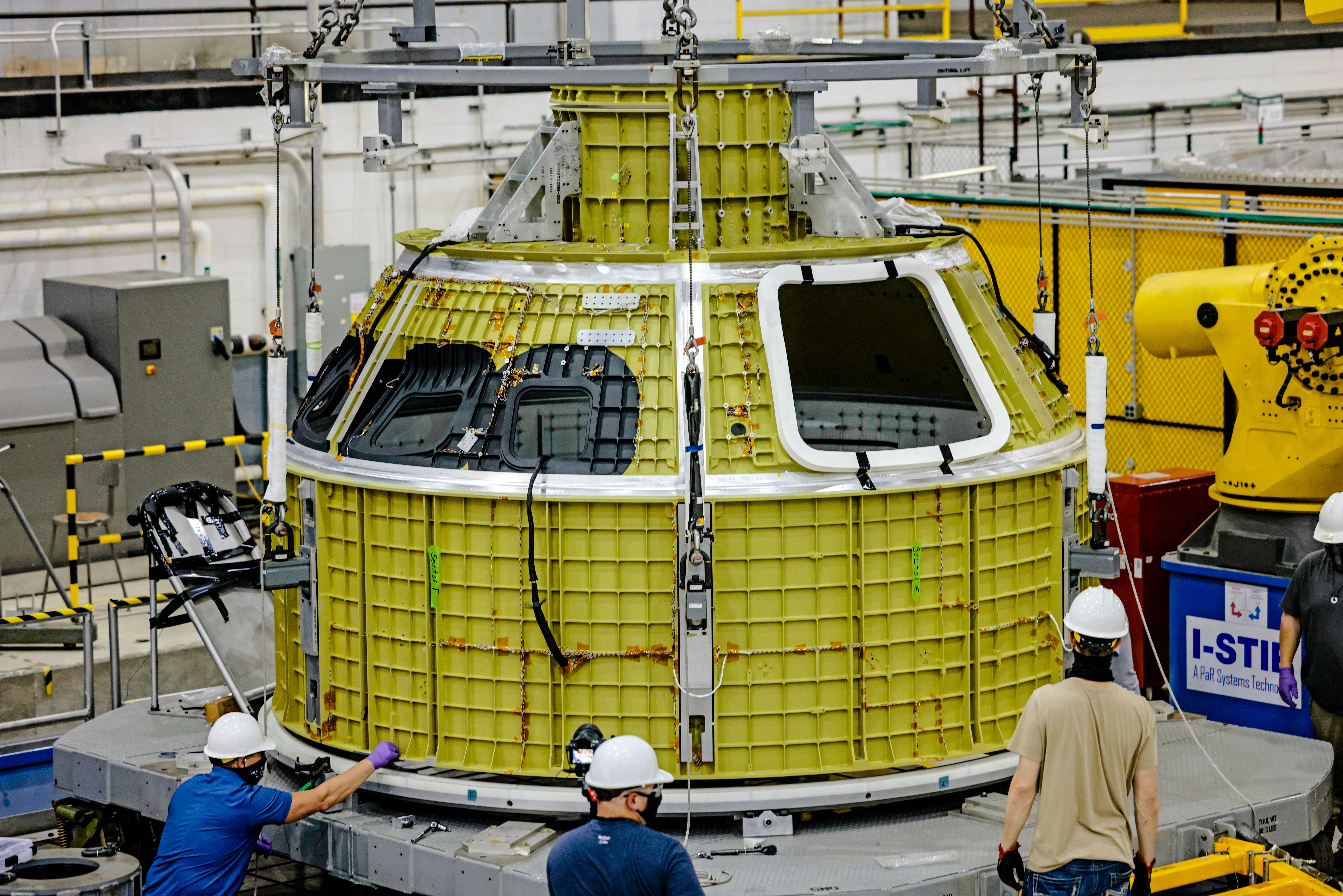 At NASA's Michoud Assembly Facility in New Orleans, Orion's newly completed pressure vessel for the Artemis III mission is lifted out of the welding tool on Aug. 27, 2021. The pressure vessel is the primary structure for Orion's crew module, joined together using state-of-the-art welding by technicians from lead contractor Lockheed Martin.