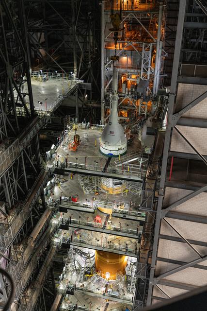 The Orion spacecraft for NASA’s Artemis I mission, fully assembled with its launch abort system, is stacked on the Space Launch System (SLS) rocket in High Bay 3 of the Vehicle Assembly Building at Kennedy Space Center in Florida on Oct. 20, 2021. The stacking of Orion on top of the SLS completes assembly for the Artemis I flight test. Teams will begin conducting a series of verification tests ahead of rolling out to Launch Complex 39B for the Wet Dress Rehearsal.