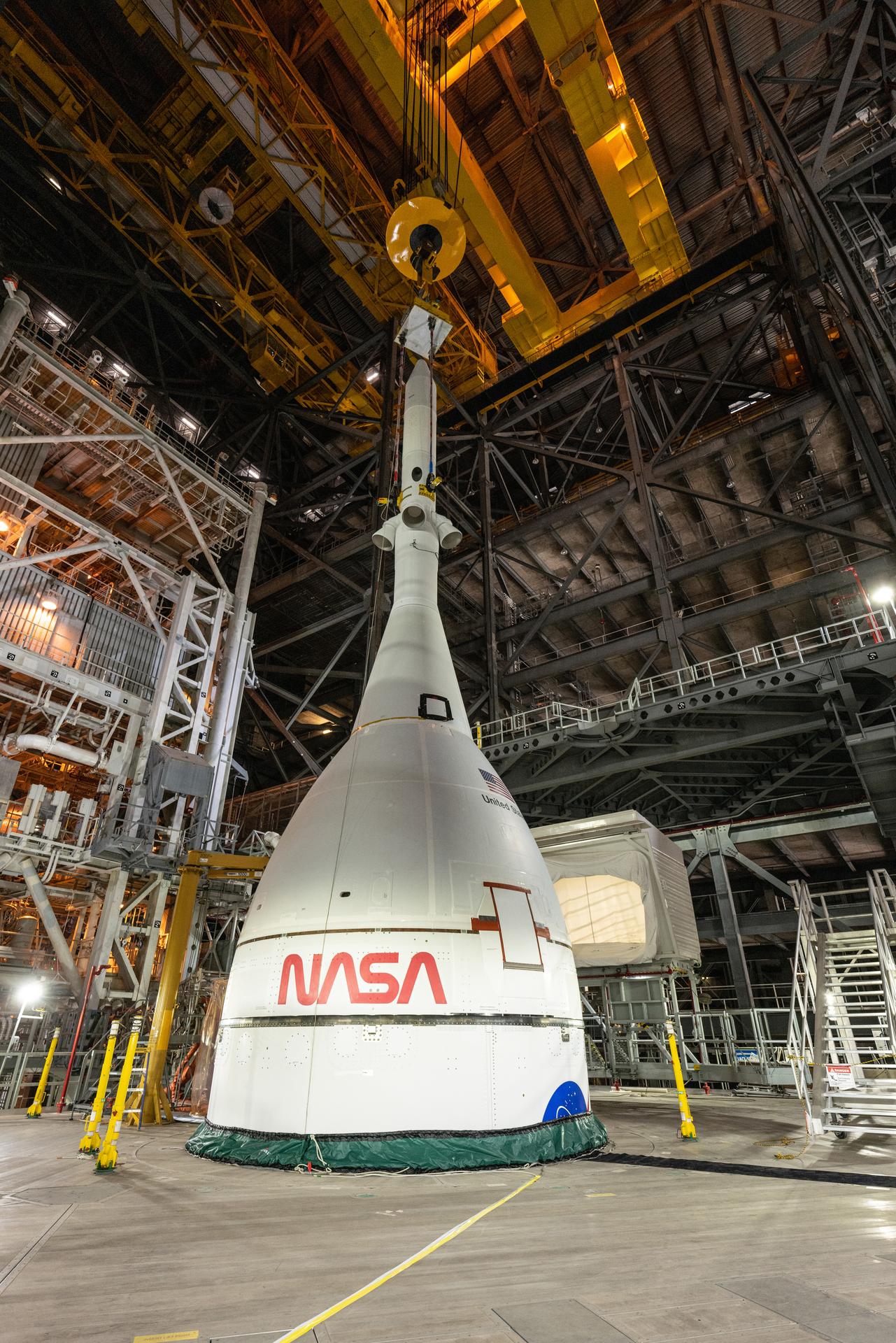 The Orion spacecraft for NASA’s Artemis I mission, fully assembled with its launch abort system, is stacked on the Space Launch System (SLS) rocket in High Bay 3 of the Vehicle Assembly Building at Kennedy Space Center in Florida on Oct. 20, 2021. The stacking of Orion on top of the SLS completes assembly for the Artemis I flight test. Teams will begin conducting a series of verification tests ahead of rolling out to Launch Complex 39B for the Wet Dress Rehearsal.