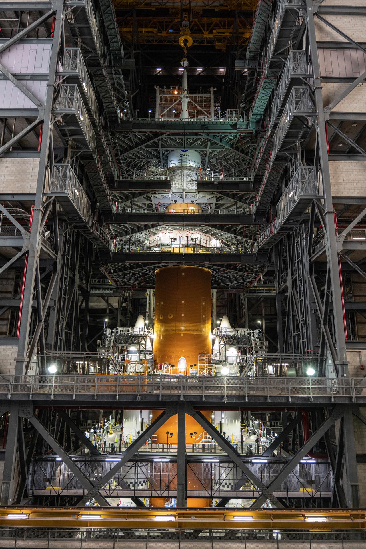 The Orion spacecraft for NASA’s Artemis I mission, fully assembled with its launch abort system, is stacked on the Space Launch System (SLS) rocket in High Bay 3 of the Vehicle Assembly Building at Kennedy Space Center in Florida on Oct. 20, 2021. The stacking of Orion on top of the SLS completes assembly for the Artemis I flight test. Teams will begin conducting a series of verification tests ahead of rolling out to Launch Complex 39B for the Wet Dress Rehearsal.