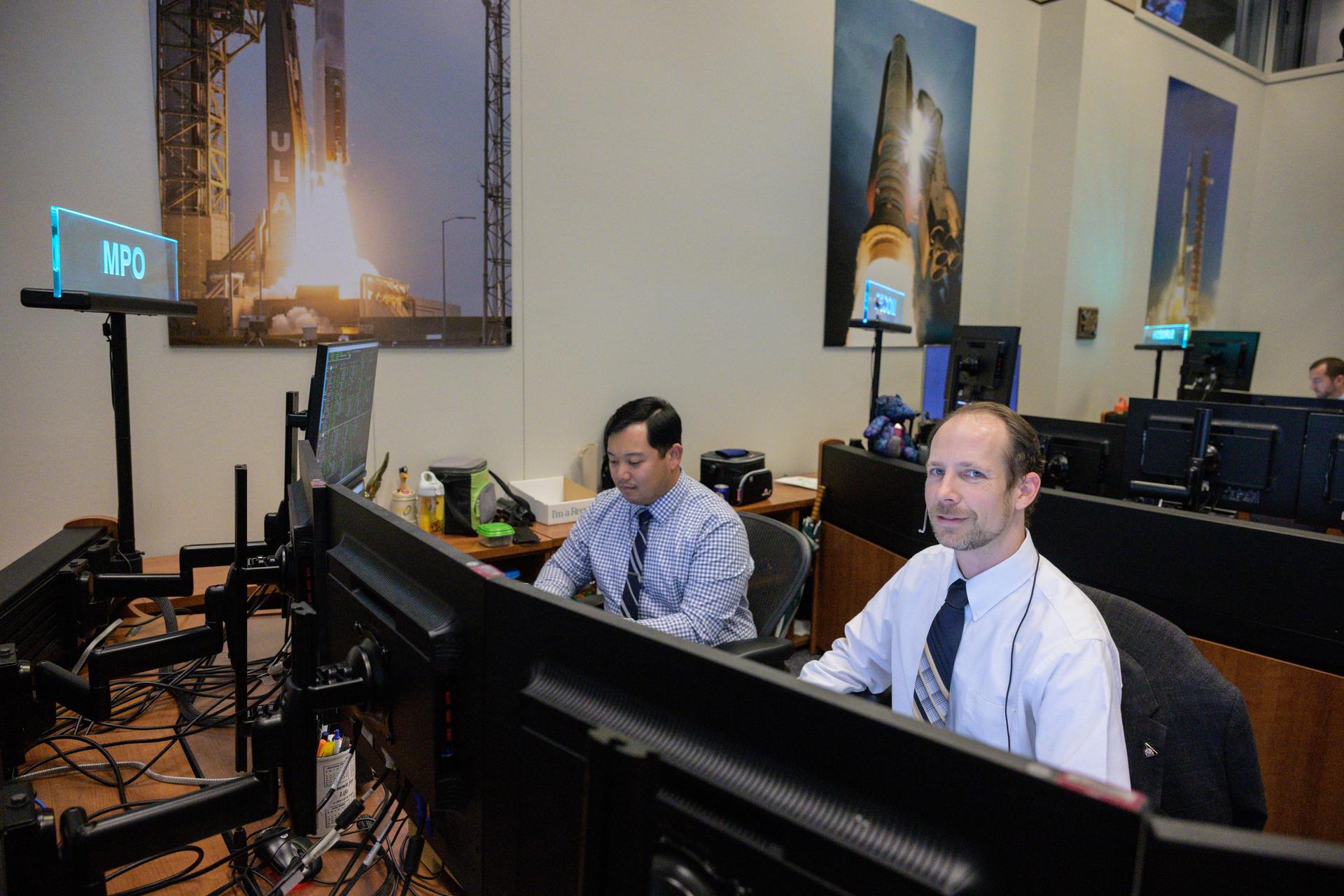 jsc2022e090747 (Dec. 1, 2022): Flight controllers Doug Haskovec and Amar Ollero at the mechanical and power officer console in Houston’s Mission Control Center observe the Orion spacecraft under the direction of Flight Director Rick LaBrode. The spacecraft departed its distant retrograde orbit on flight day 16 of the Artemis I mission – one of the steps needed to bring the spacecraft home from the Moon. Credit: NASA/Robert Markowitz