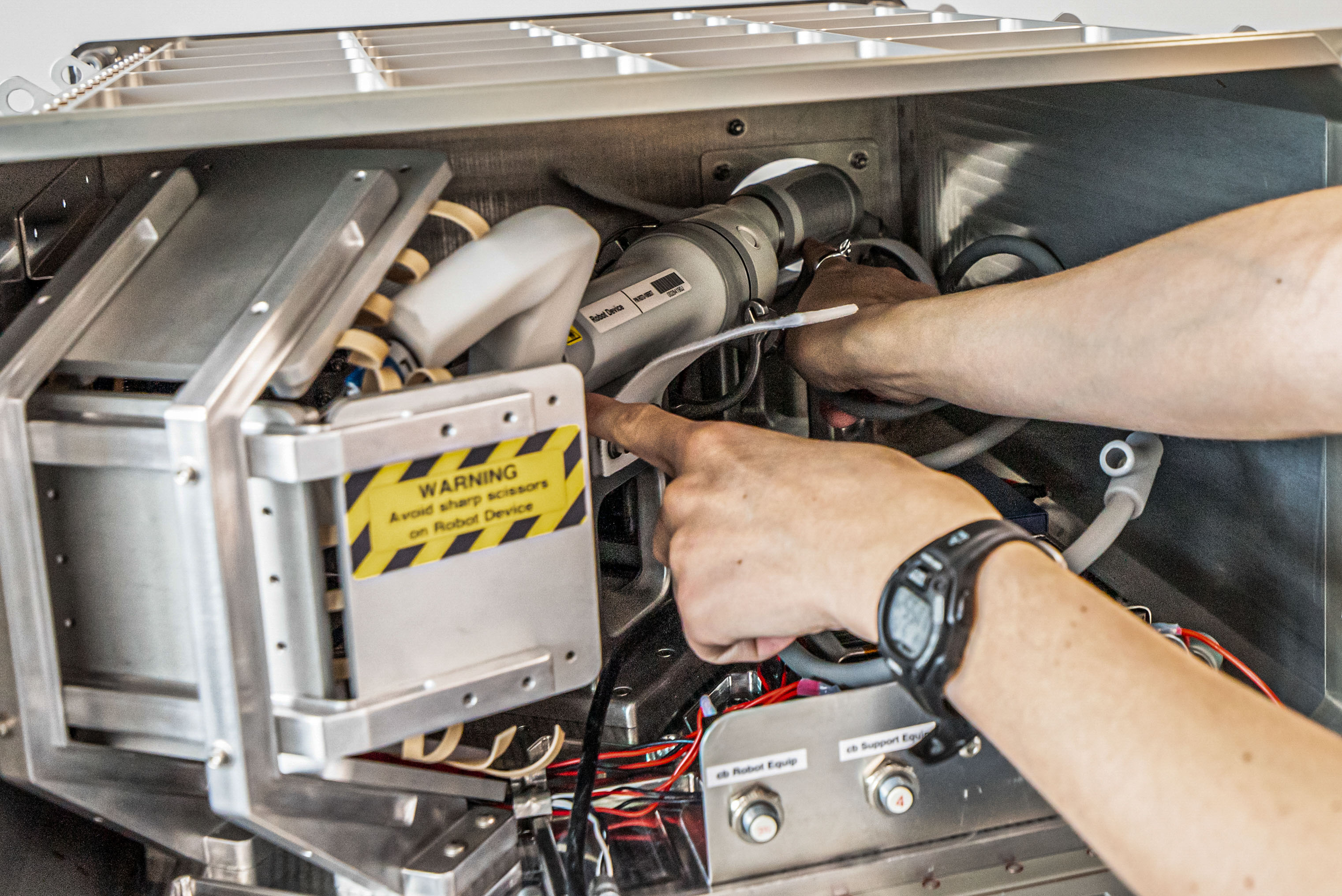jsc2024e005981 (9/15/2023) --- The robotic surgery device is shown positioned inside the science locker, with the instrument arms and camera oriented toward the simulated surgical tissue on the experiment board. The unique small footprint makes it possible to transport the minibot anywhere, even to space. Robotic Surgery Tech Demo flies a special iteration of MIRA, Virtual Incision’s miniaturized robotic assisted surgery system. Image courtesy of Virtual Incision.
