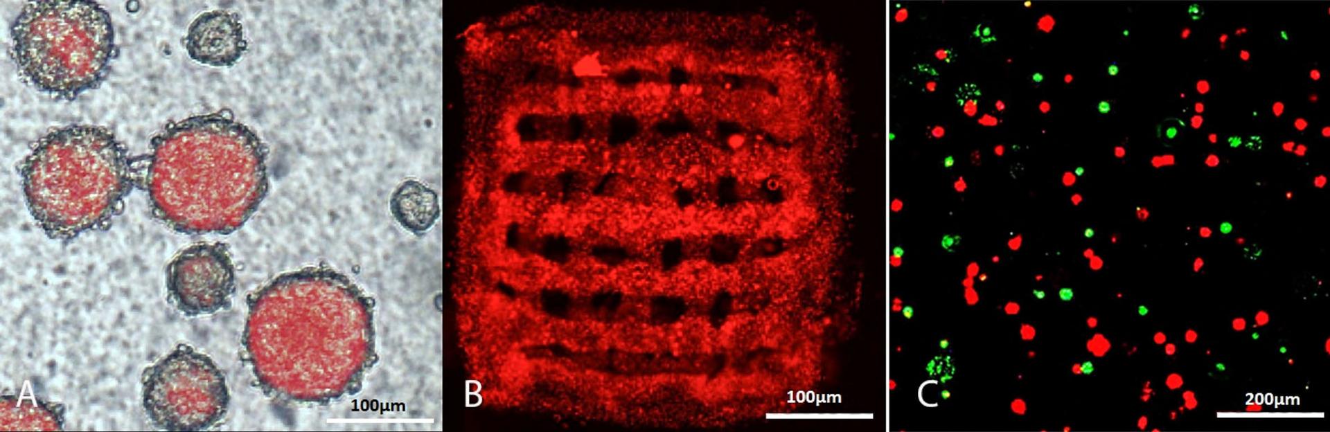 jsc2024e006078 (1/18/2024) --- A = Free floating BC neurospheres, produced from 11 days mouse embryo, expressing red fluorescent protein under actin promoter; B = 3D-printed BC neurospheres in gelatin scaffold 3 days after printing; C = BC neuropsheres survival after Maser15 microgravity exposure (NucGreen™ Dead 488 ReadyProbes (Invitrogen, Cat# R37109) staining for green dead BC neuropsheres, and live BC neurospheres imaged in red without staining). Credit: Uppsala University, Department of Immunology, Genetics and Pathology