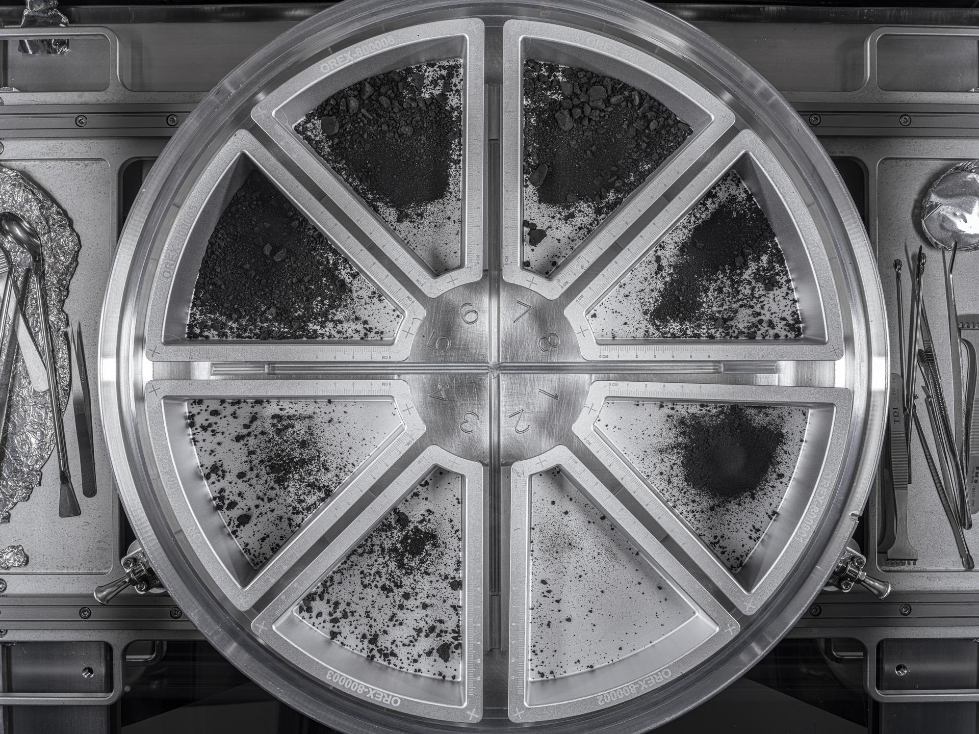 A view of eight sample trays containing the final material from asteroid Bennu. The dust and rocks were poured into the trays from the top plate of the Touch-and-Go Sample Acquisition Mechanism (TAGSAM) head. 51.2 grams were collected from this pour, bringing the final mass of asteroid sample to 121.6 grams. Credit: NASA/Erika Blumenfeld & Joseph Aebersold