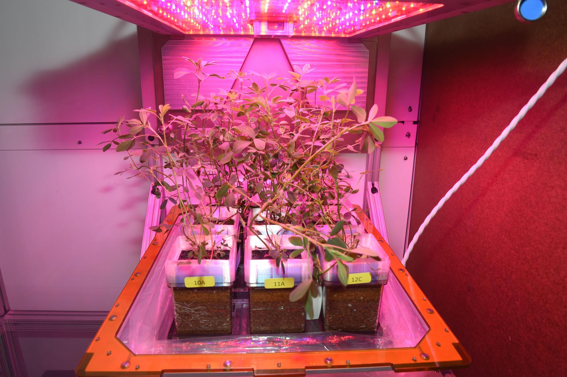 jsc2024e021223 (10/12/2023) --- This image, taken 22 days after initiation for the Veg-01 investigation, shows alfalfa plants (reduced lignin line and corresponding control) growing well. Image courtesy of Dr. Tom Dreschel.
