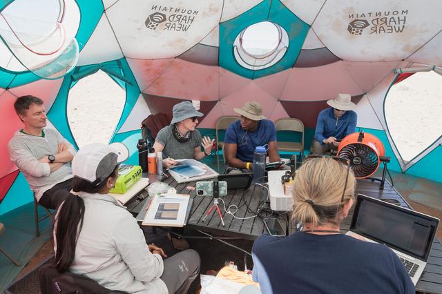 NASA astronauts Kate Rubins and Andre Douglas meet with teams to review test objectives and traverse plans before their first simulated moonwalk in a week-long field test consisting of four simulated moonwalks and six advanced technology runs in the San Francisco Volcanic Field in Northern Arizona on May 13, 2024. Credit: NASA/Josh Valcarcel