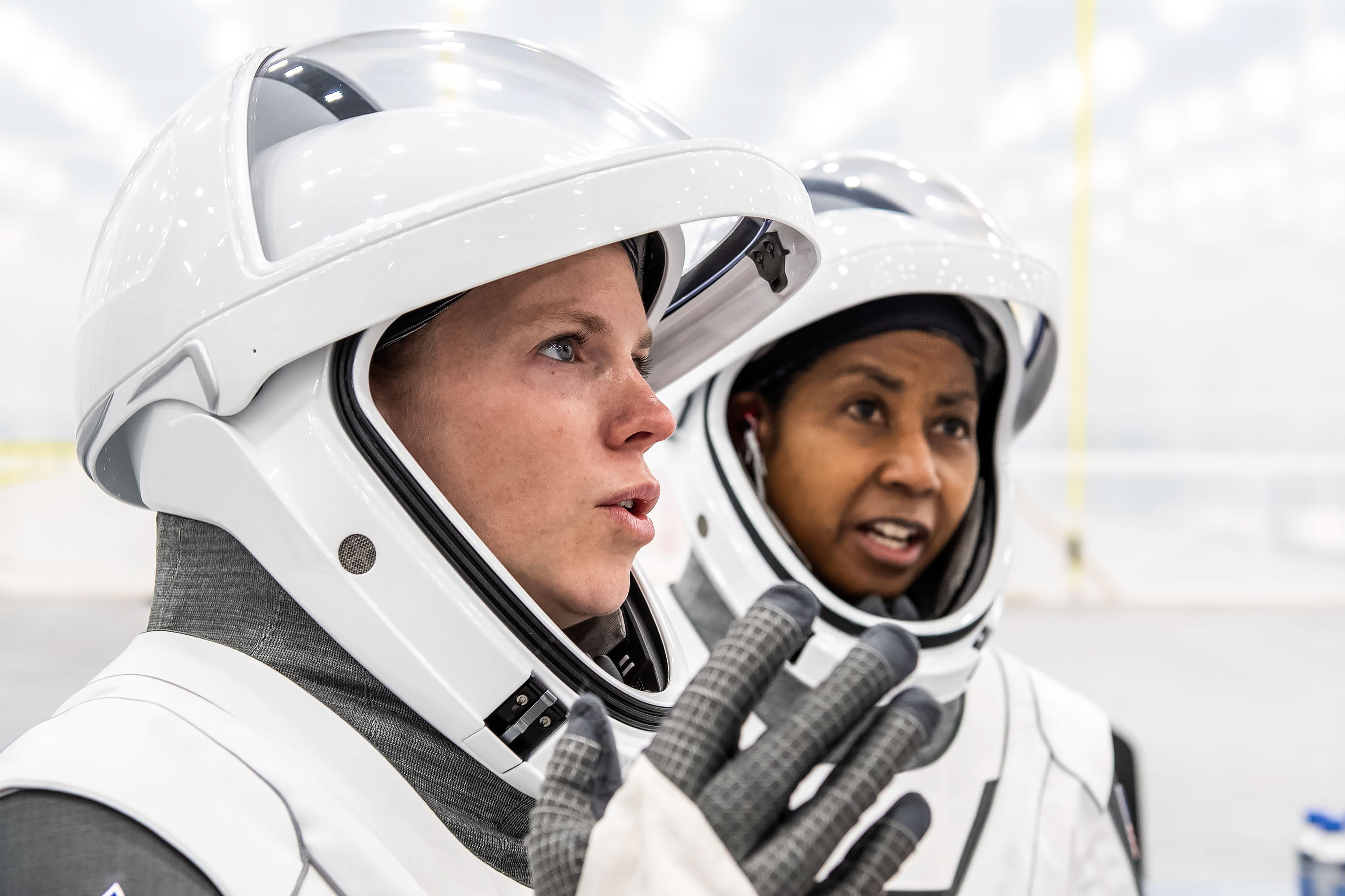 jsc2024e052324 (July 22, 2024) --- NASA’s SpaceX Crew-9 Commander Zena Cardman and Mission Specialist Stephanie Wilson are pictured in their flight suits at SpaceX’s new Dragon refurbishing facility at Kennedy Space Center in Florida. Credit: SpaceX