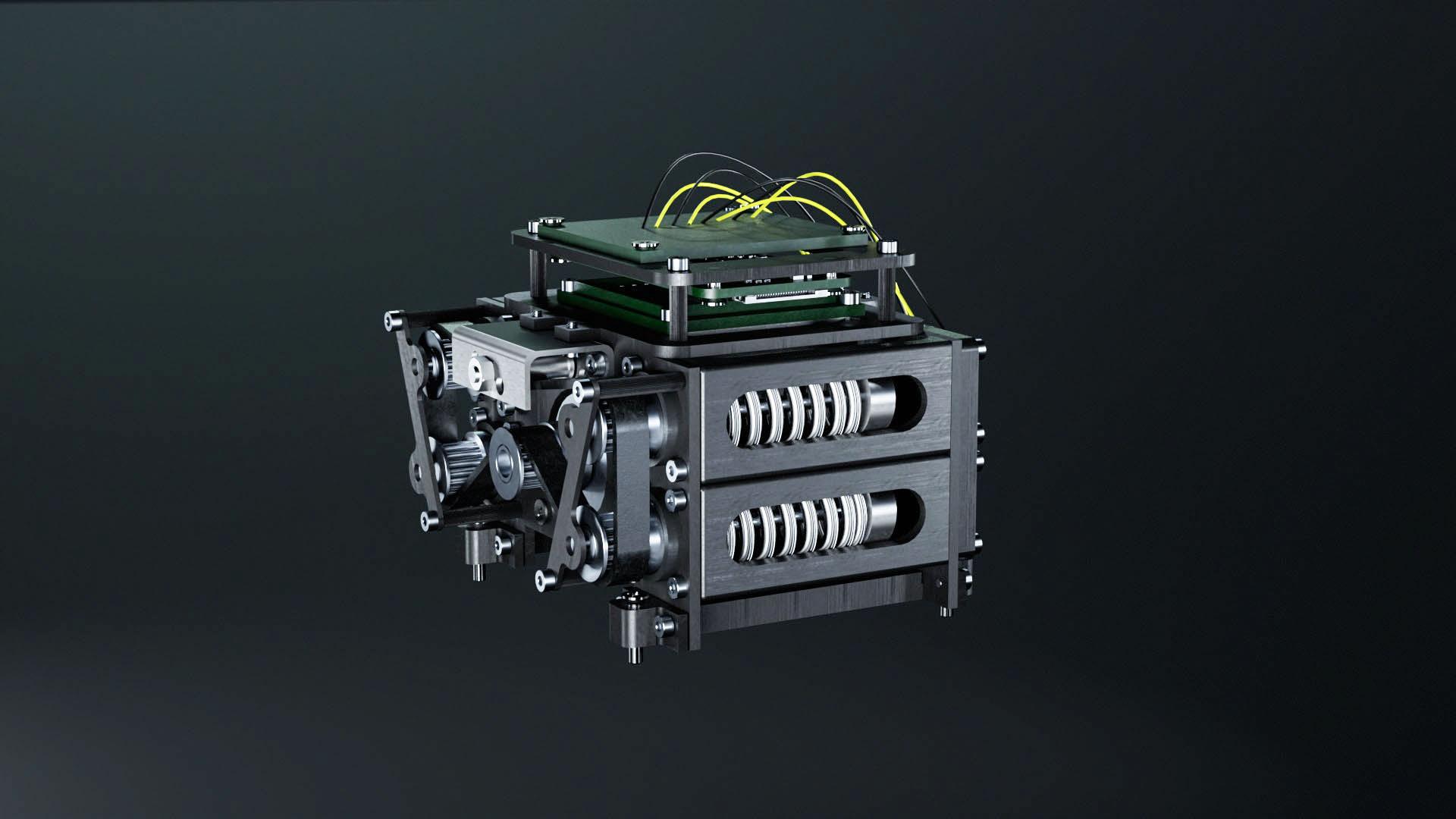 jsc2024e065166 (10/3/2024) --- Render of the Nanolab Astrobeat module core. This investigation tests cold welding in a space environment. Cold welding is a method in which metallic materials fuse or weld at ambient temperature provided that there is sufficient high contact force. Testing consists of releasing tension in springs so two pieces of metal collide to perform cold welding. Image courtesy of Dr. Leonardo Barilaro, The Malta College of Arts, Science & Technology.