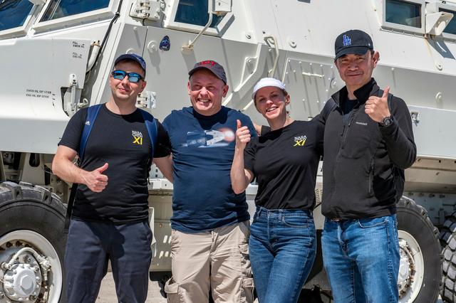 jsc2025e041100 (April 11, 2025) --- NASA’s SpaceX Crew-11 crew pose for a photo by an emergency egress vehicle at NASA’s Kennedy Space Center in Florida. Astronauts would use the emergency egress vehicle to quickly leave the launch area in the unlikely event of an emergency. From left to right: Roscosmos cosmonaut Oleg Platonov, NASA astronauts Mike Fincke and Zena Cardman, and JAXA astronaut Kimiya Yui.