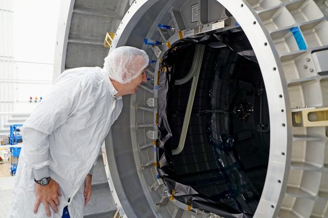 NASA astronaut Randy Bresnik peers inside the HALO module during a close-up look on April 24, 2024, at Northrop Grumman’s facility in Gilbert, Arizona. The visit was part of an event commemorating HALO’s arrival in the United States, marking a major milestone for Gateway.