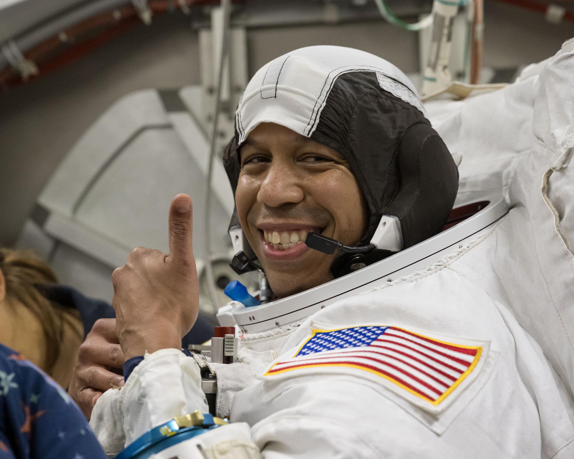 jsc2025e044425 (May 6, 2025) --- NASA astronaut Chris Williams poses for a photo in an Extravehicular Mobility Unit spacesuit during vacuum chambers testing at NASA’s Johnson Space Center in Houston, Texas.