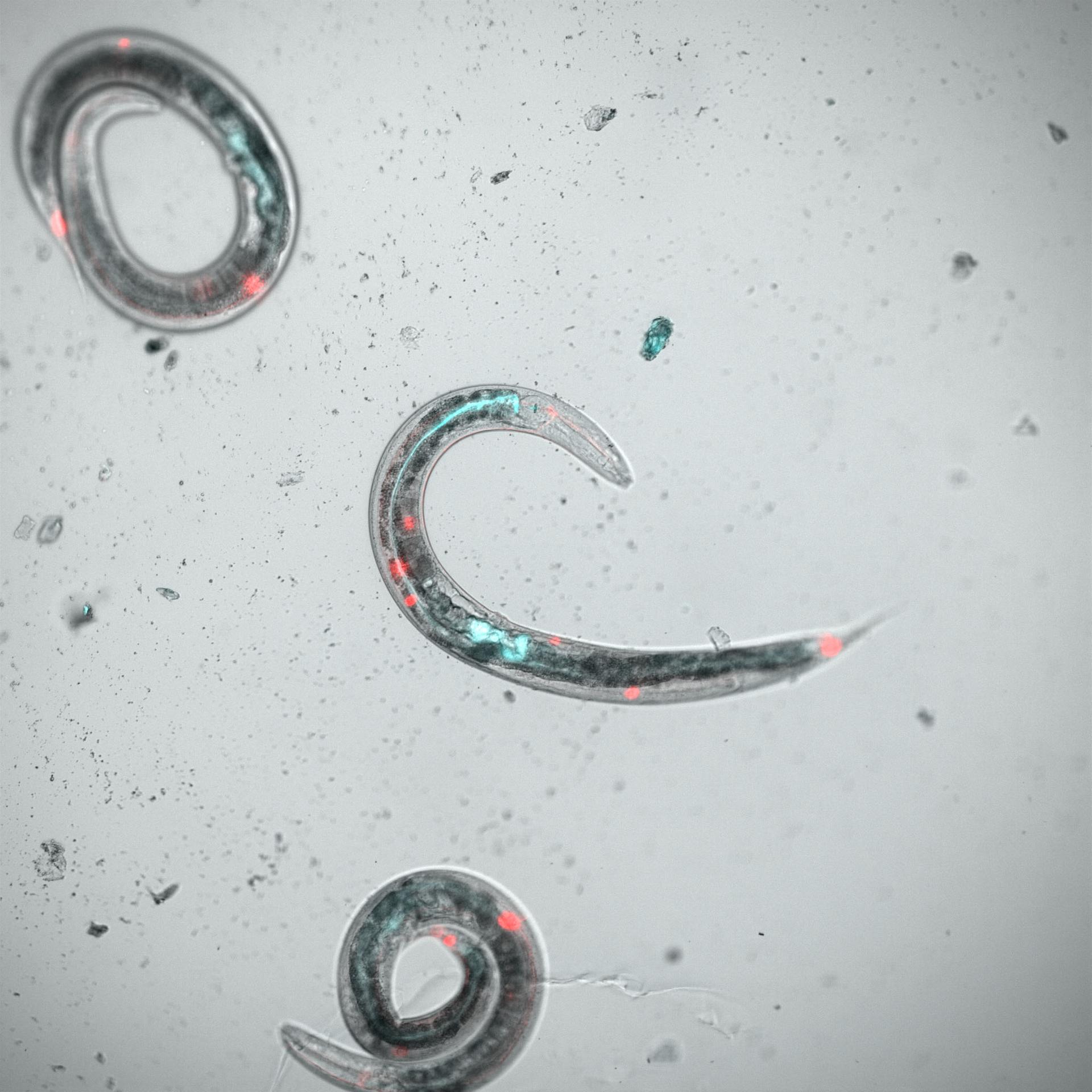 Preflight microscopic image of C. elegans worms expressing fluorescent labels, reporting on changes in gut, nerve, and muscle function as part of C. elegans Biological Investigation on Microbiome Effect in Space (CBIOMES). This investigation studies how spaceflight impacts the relationship between organisms and their gut microbiome by observing changes in nematodes down to the cellular level to identify ways to maintain microbiome stability. Credit: Baylor College of Medicine.