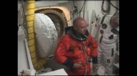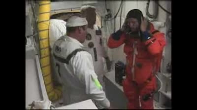 In the White Room at Launch Pad 39B, the closeout crew assists the astronauts as they, one by one, enter Discovery and are strapped in for launch.
