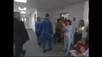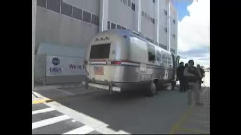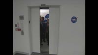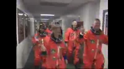 The seven STS-121 crew members, who hope to celebrate July 4th by launching aboard Discovery, suited up before leaving the Operations and Checkout Building at NASA's Kennedy Space Center in Florida. From there they travel in a convoy aboard a special van to Launch Pad 39B, a 25-minute drive accompanied by a helicopter escort.