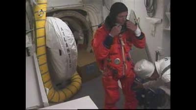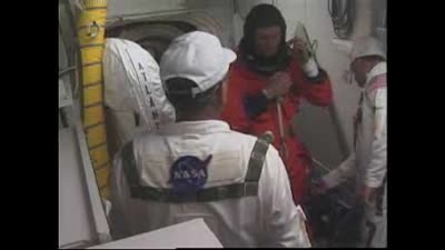 The White Room crew carefully strap the astronauts into their seats prior to closing the hatch. Atlantis will fly on mission STS-115 with a crew of six to deliver and install the P3_P4 segment to the port side of the integrated truss system on the orbital outpost. STS-115 is expected to last 11 days and includes three scheduled spacewalks.