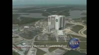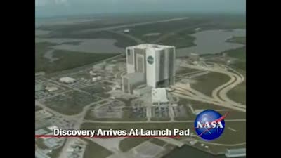 Space shuttle Discovery is in place for launch on the STS-120 mission after rolling from the Vehicle Assembly Building to Launch Pad 39A on Sept. 30, 2007. Rollout is a milestone for Discovery's launch to the International Space Station on mission STS-120. The crew will deliver and install the Italian-built U.S. Node 2, named Harmony. The pressurized module will act as an internal connecting port and passageway to additional international science labs and cargo spacecraft.