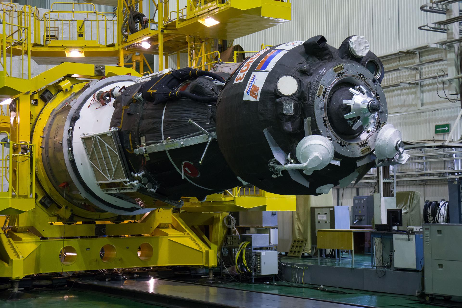 The Soyuz MS-02 spacecraft is seen after being rotated into a horizontal position in preparation for encapsulation in its fairing on Thursday, Tuesday, Oct. 11, 2016 at the Baikonur Cosmodrome in Kazakhstan. Expedition 49 flight engineer Shane Kimbrough of NASA, flight engineer Andrey Borisenko of Roscosmos, and Soyuz commander Sergey Ryzhikov of Roscosmos are scheduled to launch from the Baikonur Cosmodrome in Kazakhstan on Oct. 19. Photo Credit: (NASA/Victor Zelentsov)