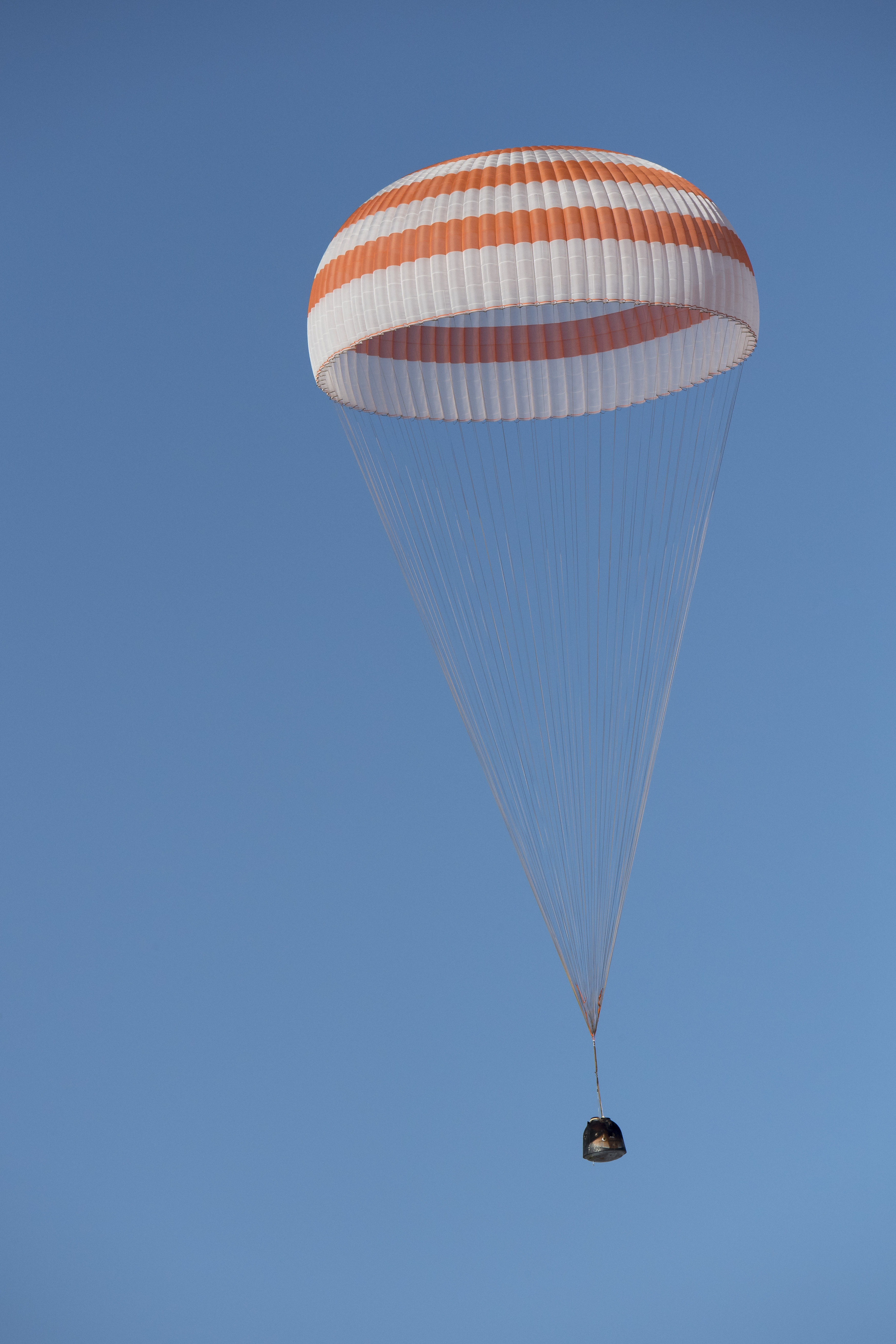 nhq201704100008 (April 10, 2017) --- The Soyuz MS-02 spacecraft is seen as it lands with Expedition 50 Commander Shane Kimbrough of NASA and Flight Engineers Sergey Ryzhikov and Andrey Borisenko of Roscosmos near the town of Zhezkazgan, Kazakhstan on Monday, April 10, 2017 (Kazakh time). Kimbrough, Ryzhikov, and Borisenko are returning after 173 days in space where they served as members of the Expedition 49 and 50 crews onboard the International Space Station. Photo Credit: (NASA/Bill Ingalls)