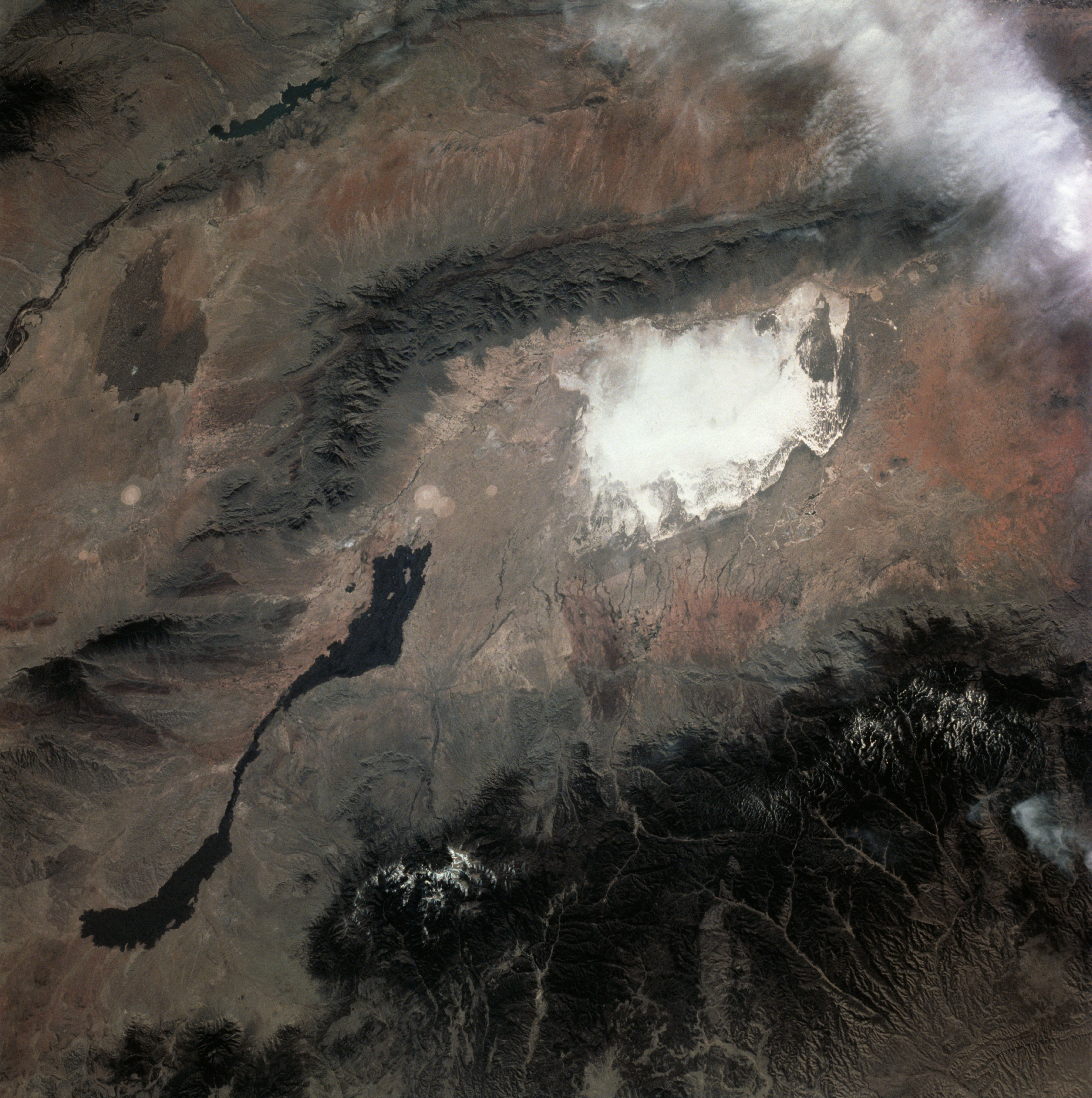 STS003-10-613 (22-30 March 1982) --- A truly remarkable view of White Sands and the nearby Carrizozo Lava Beds in southeast NM (33.5N, 106.5W). White Sands, site of the WW II atomic bomb development and testing facility and later post war nuclear weapons testing that can still be seen in the cleared circular patterns on the ground. Space shuttle Columbia (STS-3), this mission, landed at the White Sands alternate landing site because of bad weather at Edwards AFB, CA. Photo credit: NASA