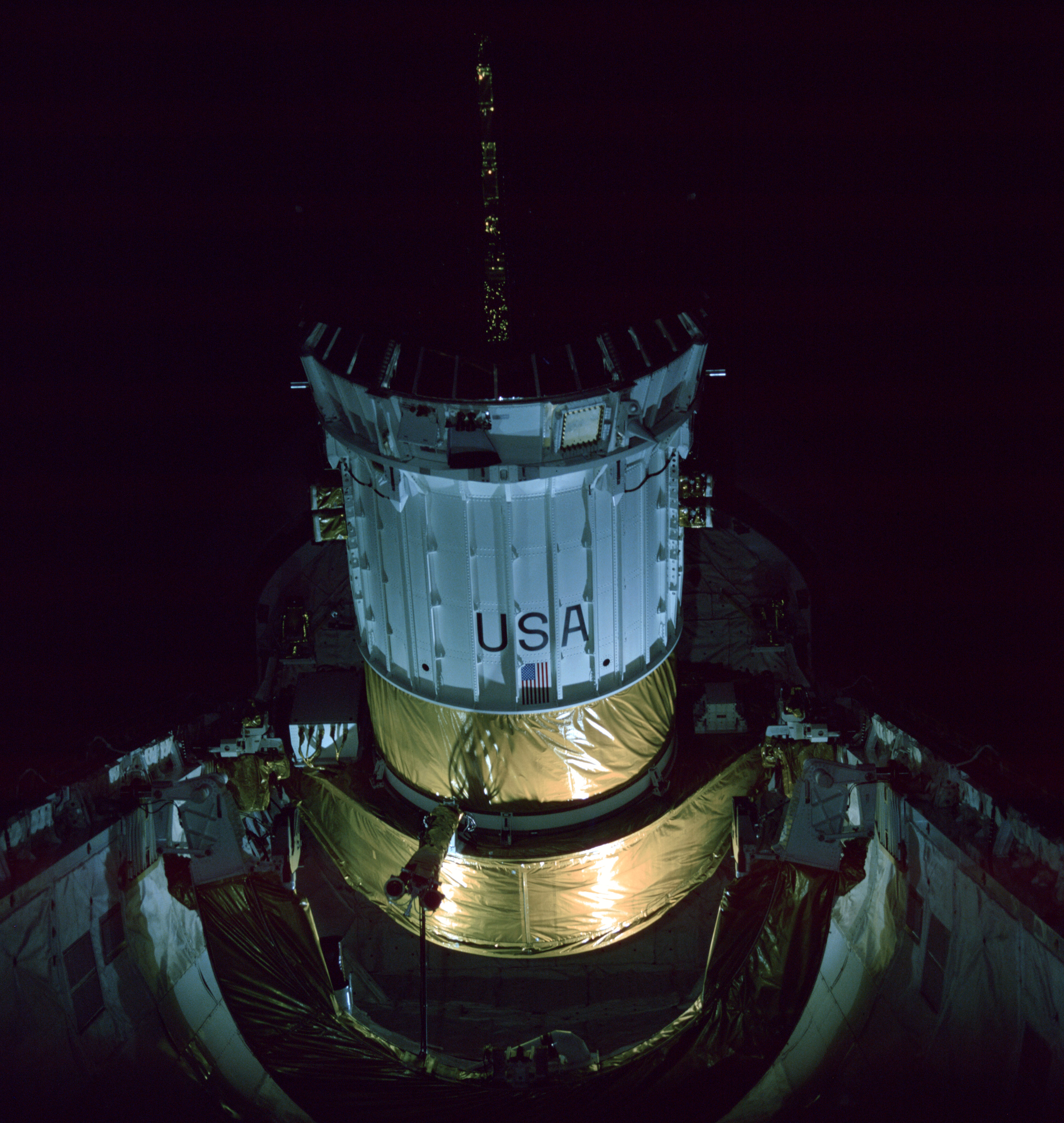 STS006-40-685 (4 April 1983) --- This view of a tilted tracking and data relay satellite (TDRS) and part of its inertial upper stage (IUS) was photographed during deployment of the TDRS/IUS tandem some 10 hours following launch of space shuttle Challenger. A 70mm camera was aimed by crew members through the aft windows of the Earth-orbiting Challenger to capture the scene. A tilt-table device was used to lift the TDRS to this position (almost 90 degrees different from its stowed position). Onboard NASA’s second reusable shuttle for this five-day flight were astronauts Paul J. Weitz, Karol J. Bobko, Dr. F. Story Musgrave and Donald H. Peterson. Photo credit: NASA