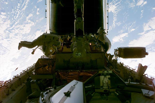S103-E-5308 (23 Dec. 1999) --- Astronauts C. Michael Foale (left) and Claude Nicollier hover above Discovery's aft cargo bay during their shared spacewalk to perform servicing tasks on the Hubble Space Telescope (HST). The photo was taken with an electronic still camera (ESC). Photo credit: NASA