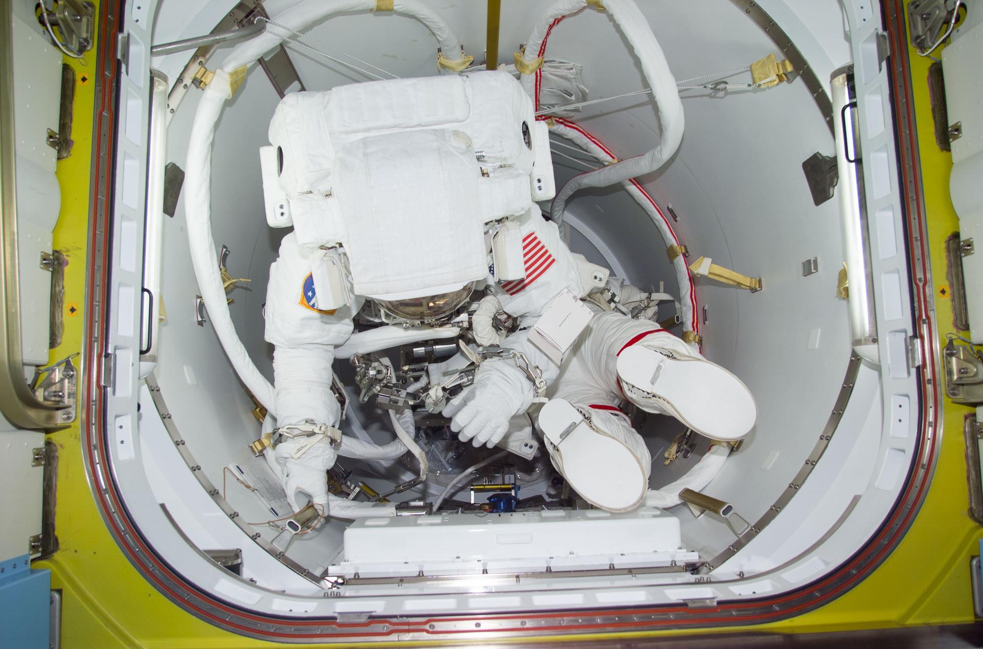 STS104-E-5201 (20 July 2001) --- Though it was a bit before Friday midnight in Houston, it was already into the morning hours of Saturday by Greenwich Mean Time (GMT) when astronauts James F. Reilly (left) and Michael L. Gernhardt were photographed with a digital still camera in the Crew Lock prior to depressurization of the compartment for the third and final space walk of STS-104.