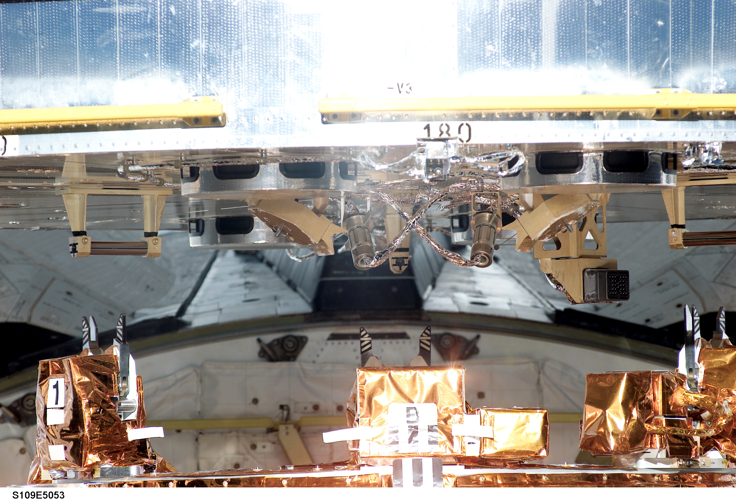 STS109-E-5053 (3 March 2002) --- The base of the Hubble Space Telescope is latched down on a special support structure in the cargo bay of the Space Shuttle Columbia. The bay's Flight Support System, as the structure (partially visible at bottom frame) is called, will hold the telescope for the next week, turning and tilting it as needed for the spacewalking work. Astronaut Nancy J. Currie, mission specialist, was in control of the Shuttle's remote manipulator system (RMS) robotic arm and astronaut Scott D. Altman, mission commander, was at the controls of the shuttle. The crew used a digital still camera to record a series of images documenting the fourth docking of a shuttle to the giant telescope during its tenure in space.