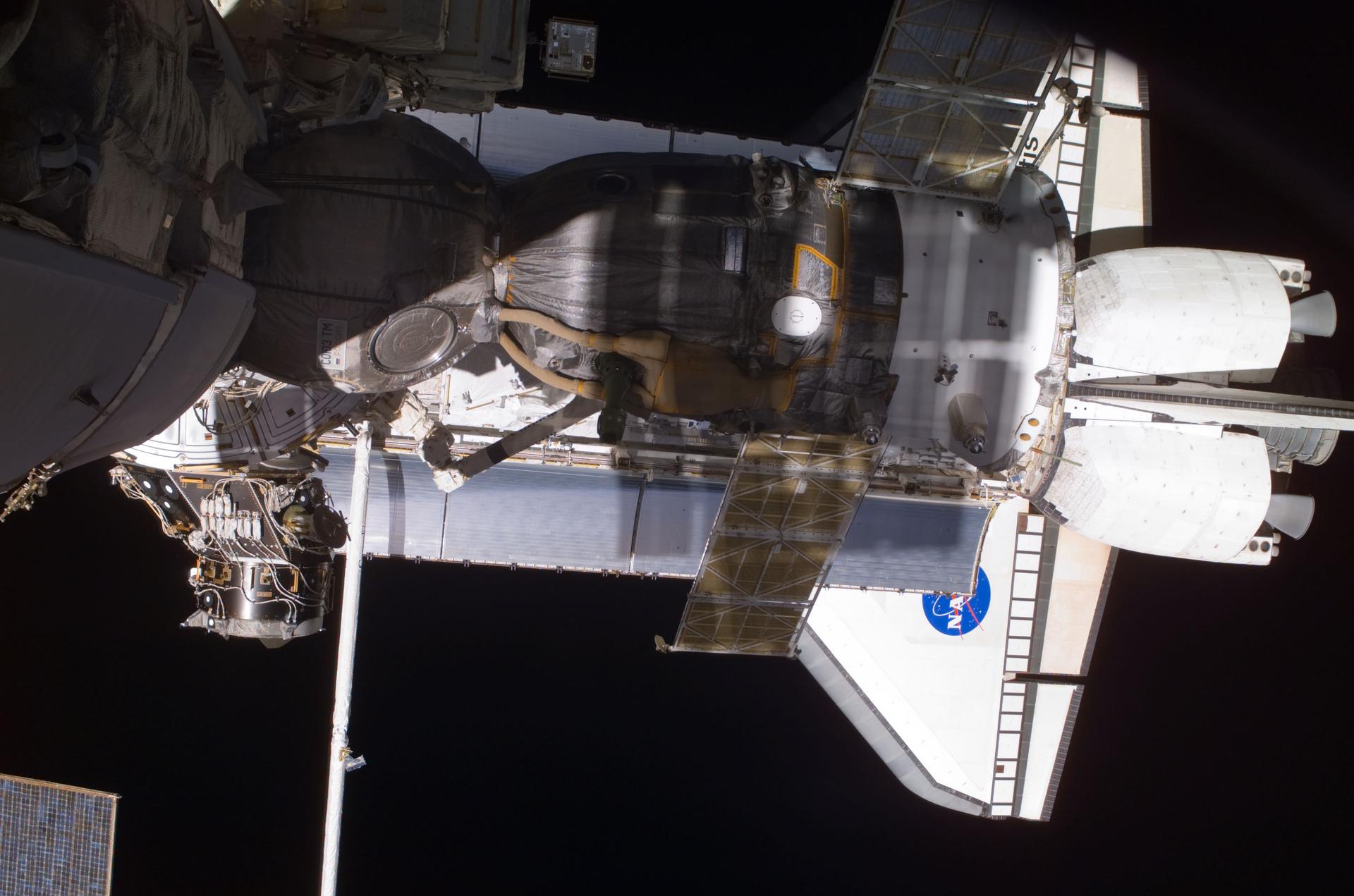 STS110-E-5149 (9 April 2002) --- Docked to the International Space Station (ISS), a Soyuz vehicle (foreground) and the Space Shuttle Atlantis were photographed by a crewmember with a digital still camera in the Pirs docking compartment on the orbital outpost.