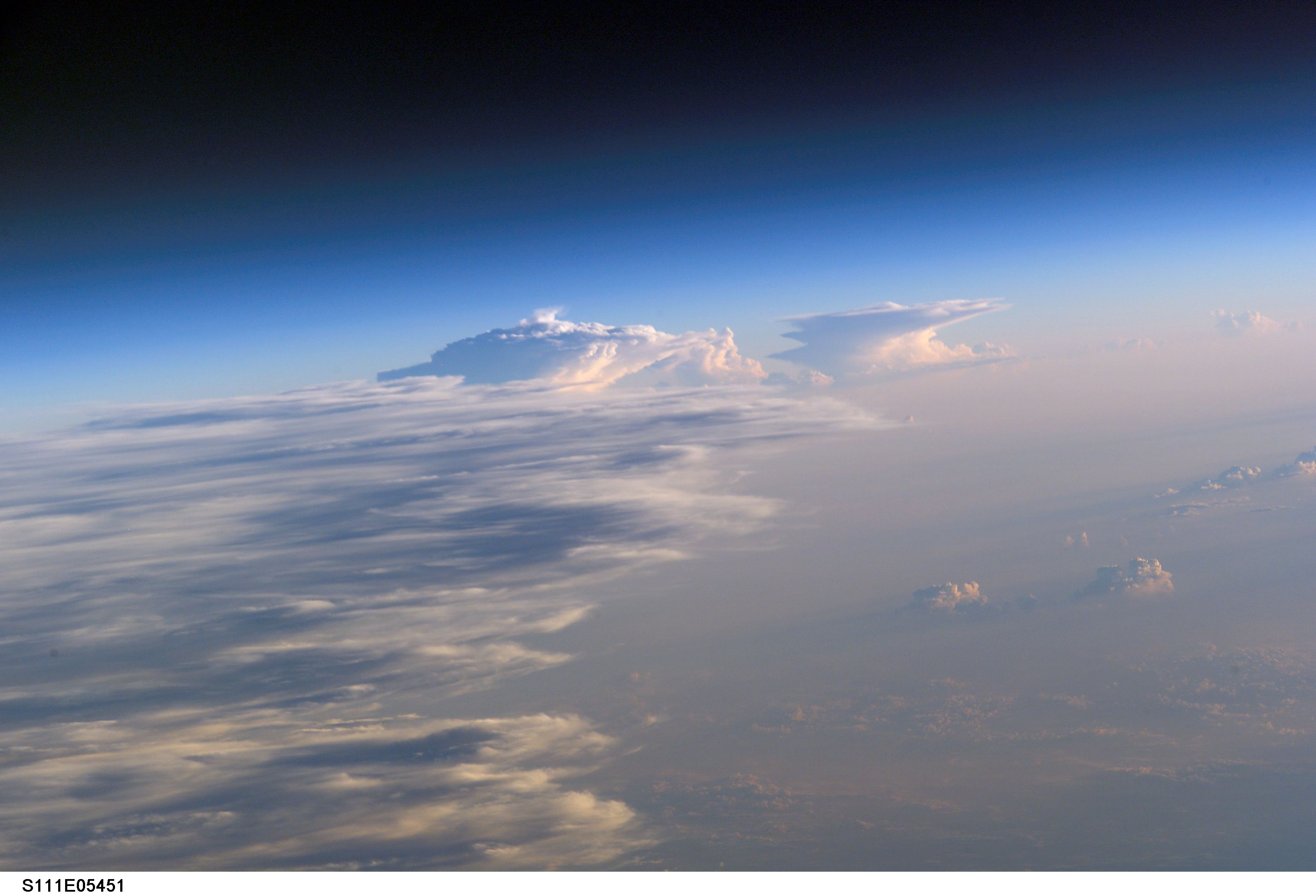 STS111-E-5451 (17 June 2002) --- Sharp air mass boundaries, such as this one photographed by astronauts on board the Space Shuttle Endeavour on June 17, 2002, often are the focus of development for severe thunderstorms. According to meteorologists, this storm formed in the late afternoon over Eastern China. The sunlit anvil tops of thunderstorms here are estimated to be in excess of 60,000 feet (18,300 meters) where icy cirrus clouds form near the top of the troposphere. The distribution and impact of such high clouds are a significant challenge to scientists modeling the Earth’s energy budget and climate. The crew of the International Space Station is attempting to acquire such imagery over Florida this summer in support of a large, multi-agency experiment CRYSTAL - FACE (Cirrus Regional Study of Tropical Anvils and Cirrus Layers - Florida Area Cirrus Experiment). This experiment is designed to collect measurements of clouds that will help improve climate models. Such photos have the potential to provide profound, synoptic visuals for use in describing and interpreting these measurements. More information on CRYSTAL - FACE as well as other images of the atmosphere are available at http://cloud1.arc.nasa.gov/crystalface/.