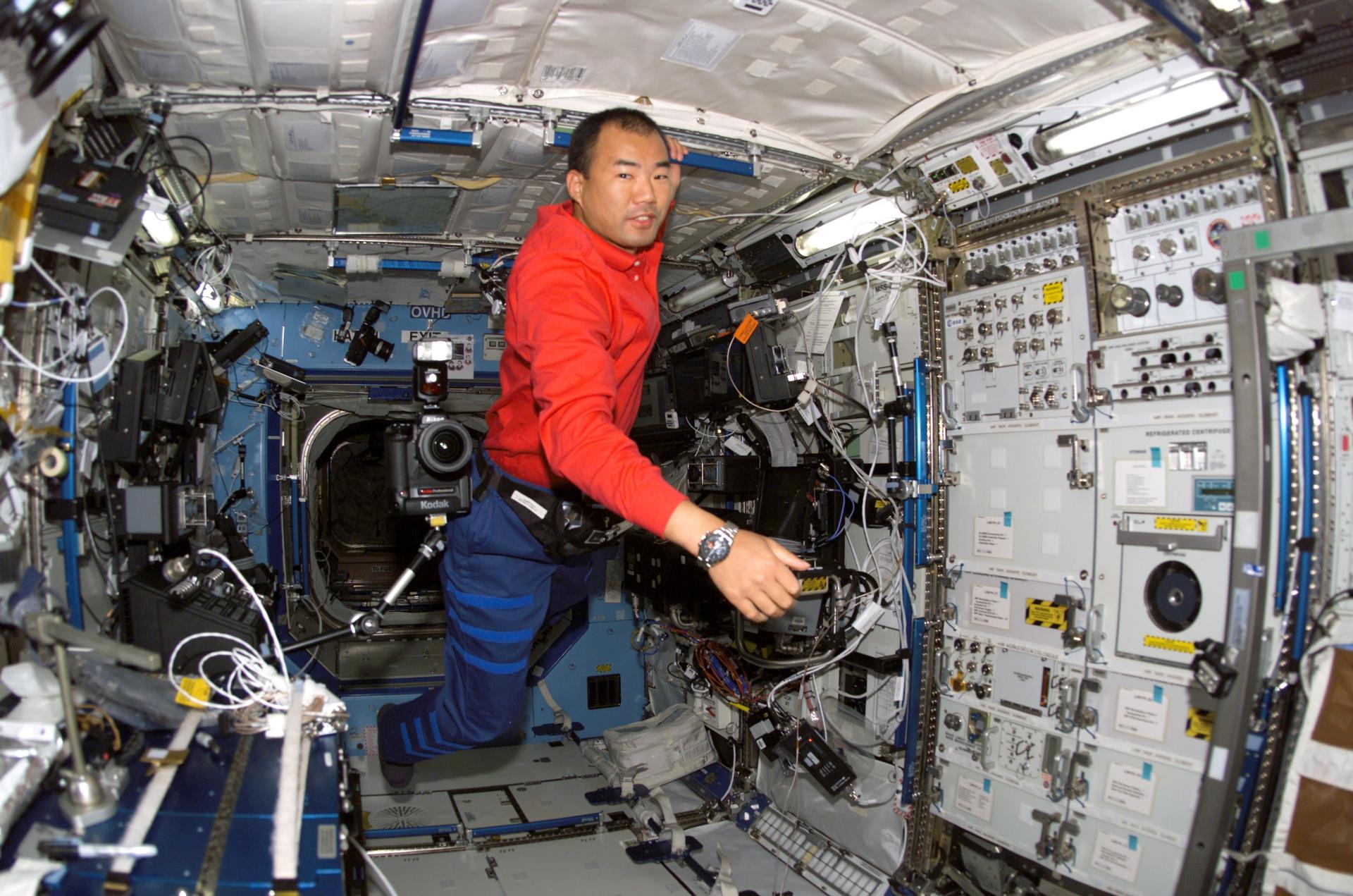 S114-E-6989 (4 August 2005) --- Astronaut Soichi Noguchi, STS-114 mission specialist representing Japan Aerospace Exploration Agency (JAXA), floats in the Destiny laboratory of the International Space Station.