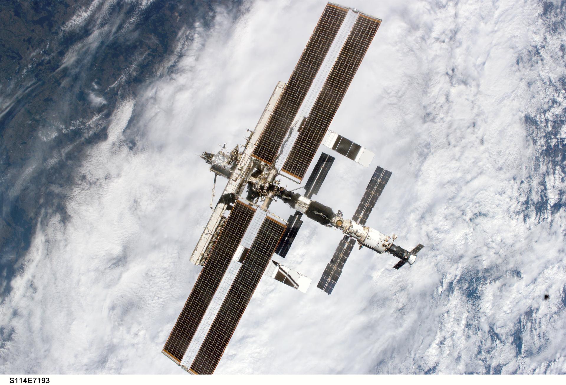 S114-E-7193 (6 August 2005) --- The International Space Station is backdropped against clouds as it moves away from the Space Shuttle Discovery after the respective crews concluded nine days of cooperative work. Undocking occurred at 2:24 a.m. (CDT), August 6, 2005.