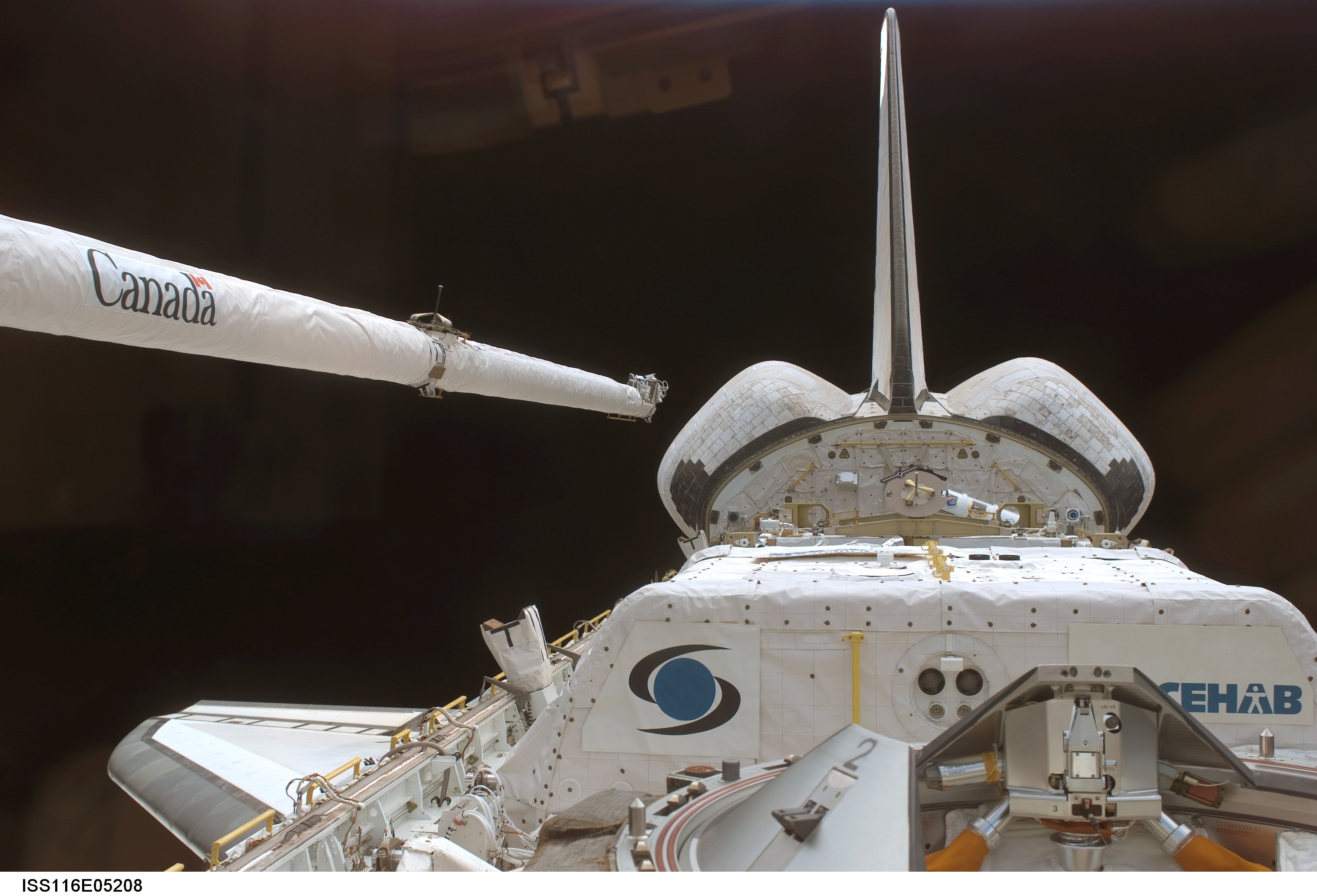 S116-E-05208 (10 Dec. 2006) --- As seen through windows on the aft flight deck of Space Shuttle Discovery, the payload bay is featured in this image photographed by a STS-116 crewmember during flight day two activities. Pictured in the payload bay is the Spacehab module and the Canadian-built Remote Manipulator System/Orbiter Boom Sensor System (RMS/OBSS) is at left. The shuttle's docking mechanism is visible in the foreground.