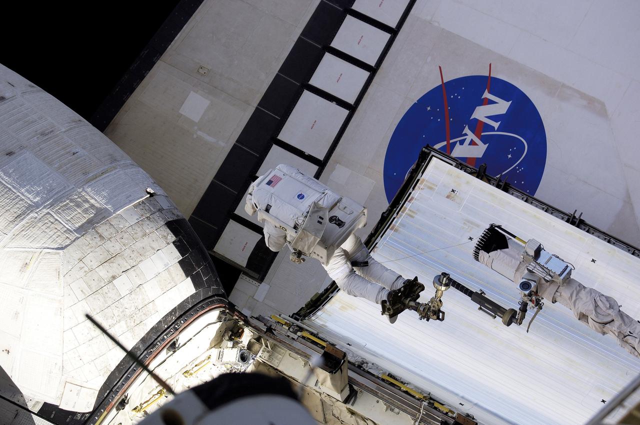 S117-E-08998 (15 June 2007) --- Medium wide scene of Atlantis' port side orbital maneuvering system pod and part of its wing prior to thermal tile protection system repair work performed by astronaut John (Danny) Olivas, STS-117 mission specialist. Olivas is seen here hovering with his feet anchored to the mobile foot restraint on the end of the Canadian-built remote manipulator system (RMS). Olivas went on to spend two hours stapling and pinning down this piece of thermal blanket on the port side OMS pod. The 4-by-6-inch corner of the blanket, which is visible here as a fist-sized black interruption to the pod's whiteness, peeled up during the shuttle's launch last week.