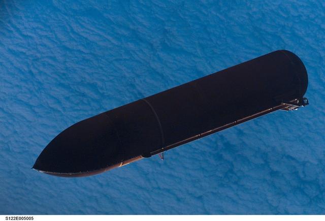 S122-E-005005 (7 Feb. 2008) --- Backdropped against a blanket of clouds, the STS-122 external fuel tank (ET) begins its relative separation from the Space Shuttle Atlantis. An STS-122 crewmember recorded the scene with a digital still camera.