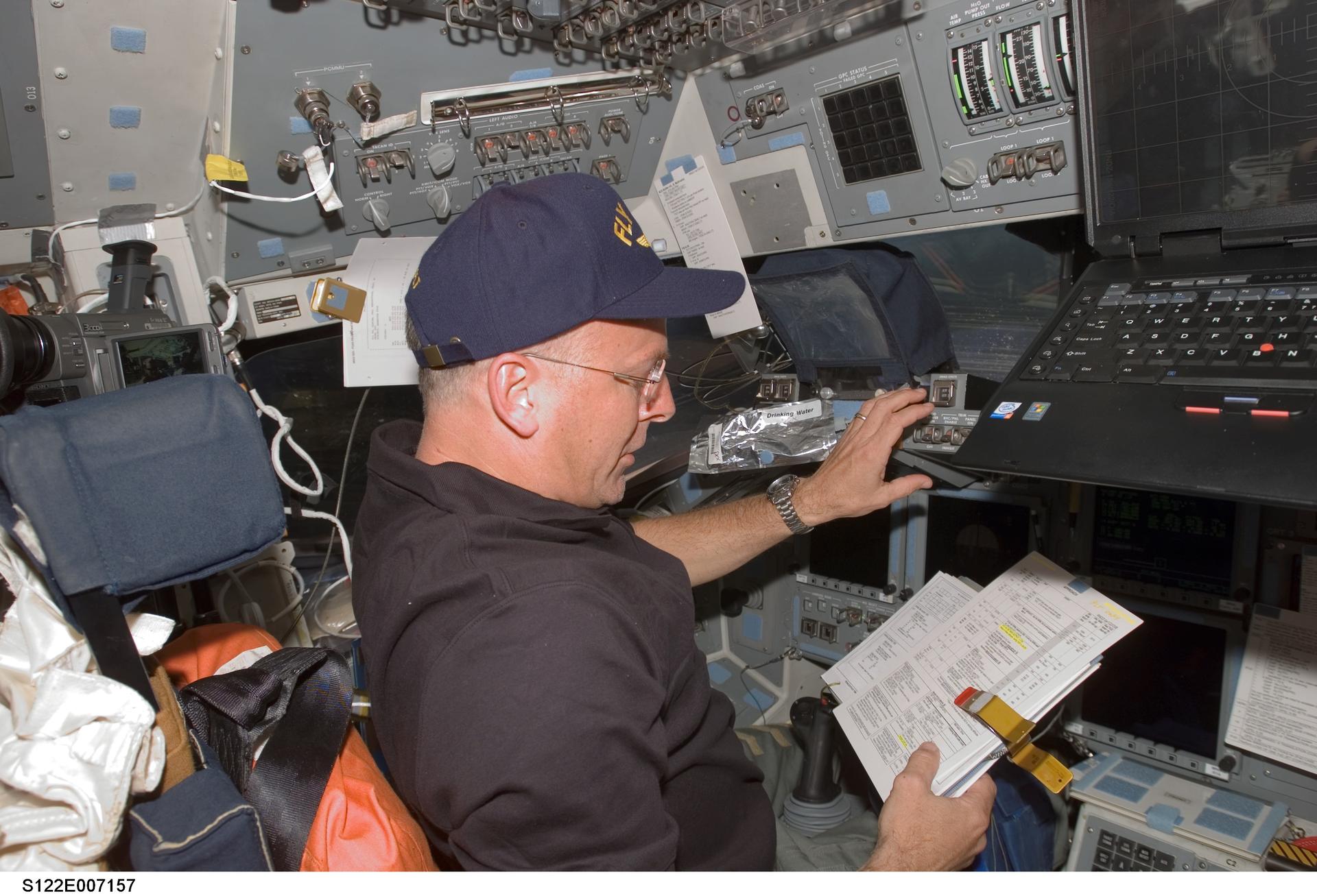 S122-E-007157 (9 Feb. 2008) --- Astronaut Alan Poindexter, STS-122 pilot, looks over a checklist while working on the flight deck of Space Shuttle Atlantis during flight day three activities.