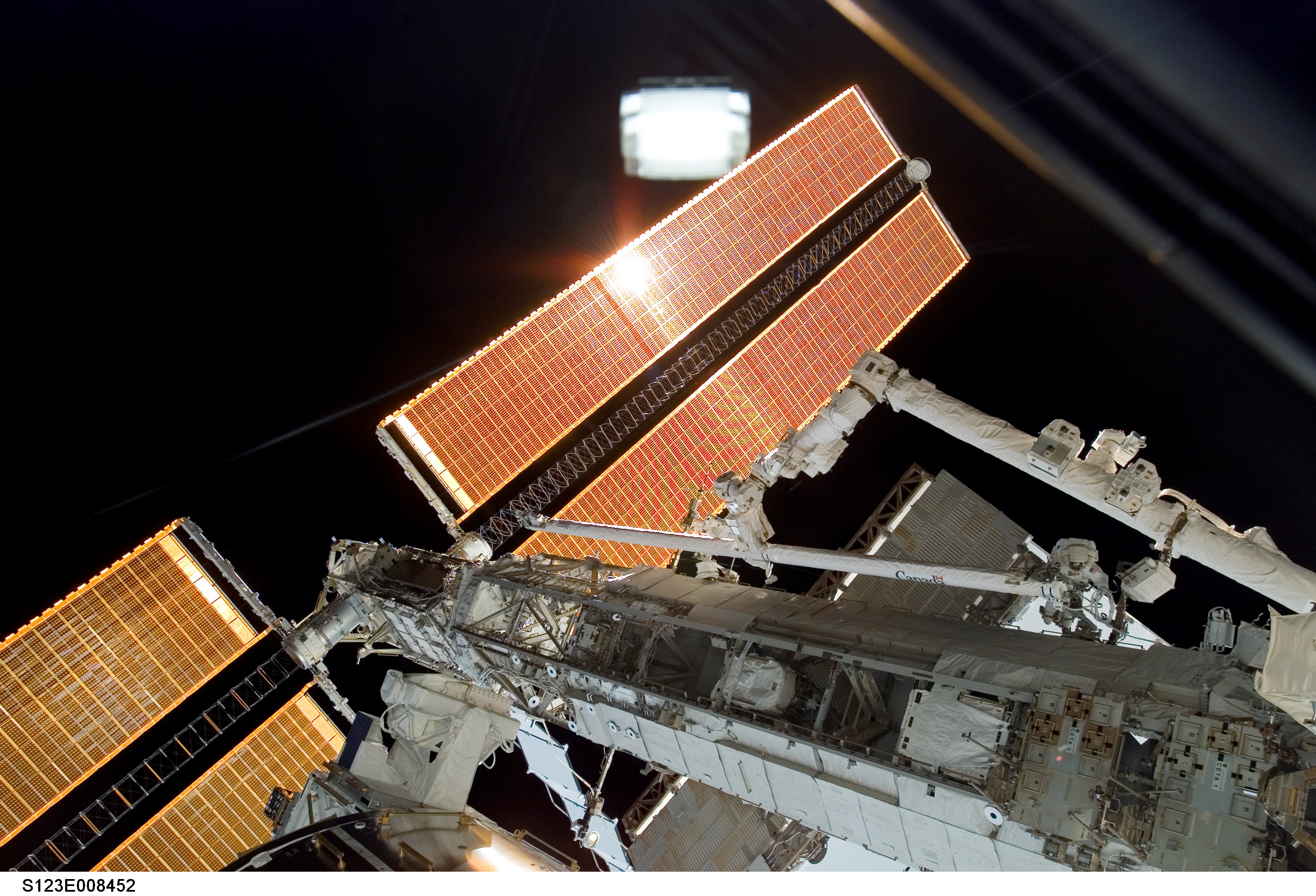 S123-E-008452 (23 March 2008) --- The Canadarm2, or Space Station Remote Manipulation System (SSRMS) robot arm, completes the handoff of the Orbiter Boom Sensor System for stowage on the International Space Station's S1 truss. There is no room on the next shuttle flight to launch with the sensor system onboard, so for the first time, it is being stowed on the orbital outpost prior to the undocking of the ISS and Space Shuttle Endeavour.