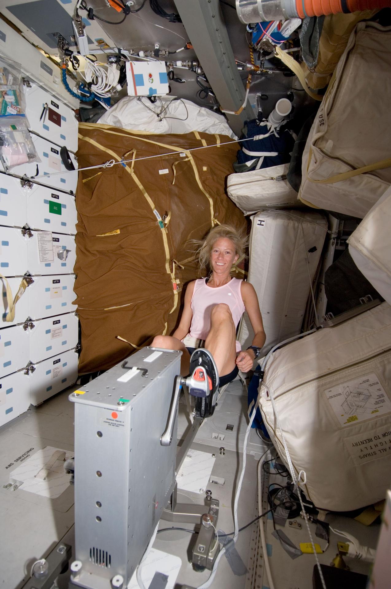 S124-E-005447 (1 June 2008) --- Astronaut Karen Nyberg, STS-124 mission specialist, exercises on the bicycle ergometer on the middeck of Space Shuttle Discovery.
