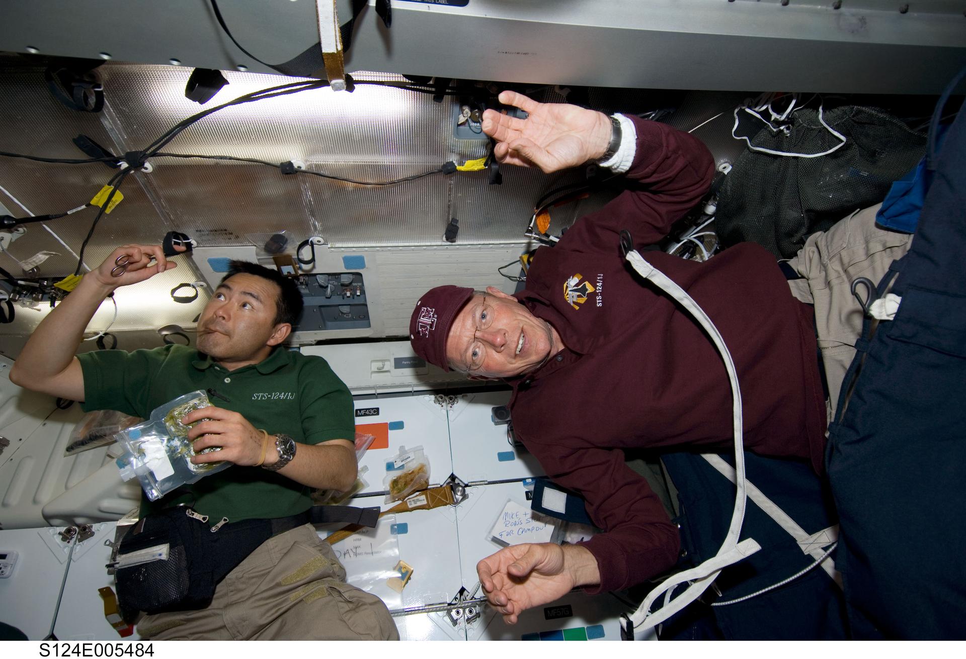 S124-E-005484 (1 June 2008) --- Japan Aerospace Exploration Agency (JAXA) astronaut Akihiko Hoshide (left) and NASA astronaut Mike Fossum, both STS-124 mission specialists, are pictured on the middeck of Space Shuttle Discovery during flight day two activities.