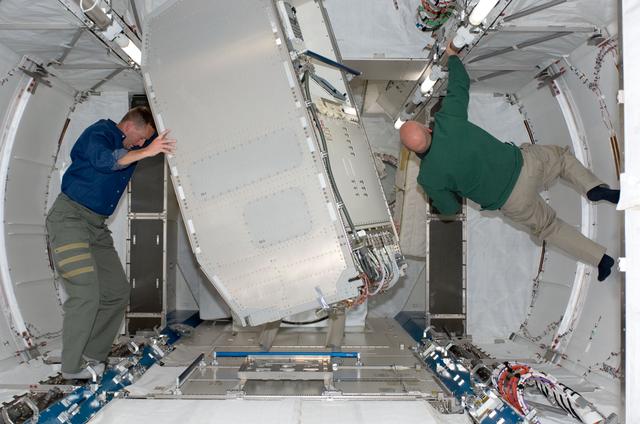 S124-E-006272 (4 June 2008) --- Astronauts Mark Kelly (right) and Ken Ham, STS-124 commander and pilot, respectively, work in the newly installed Kibo Japanese Pressurized Module (JPM) of the International Space Station while Space Shuttle Discovery is docked with the station.