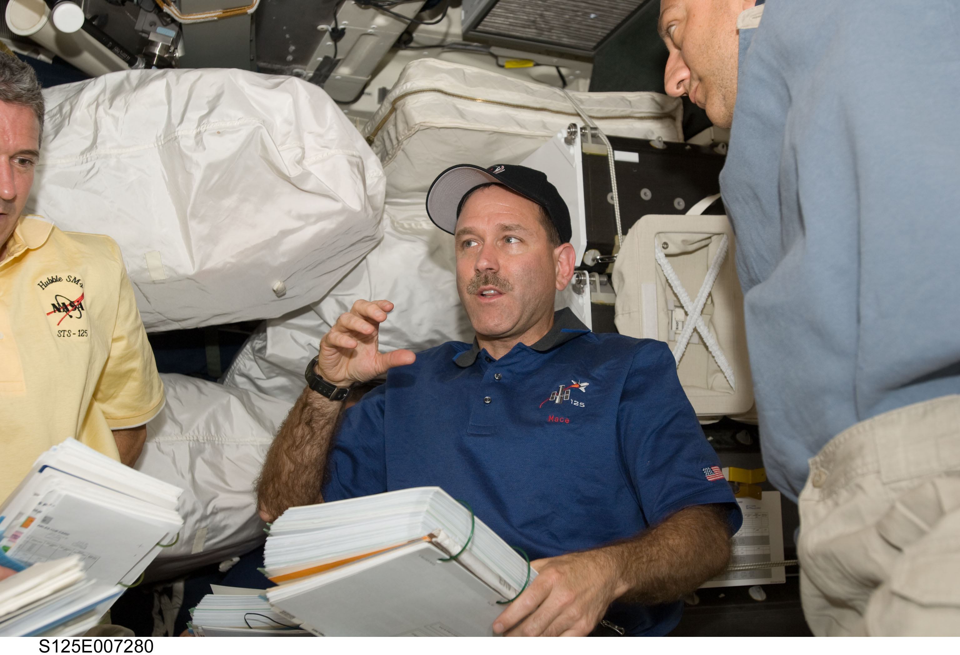 S125-E-007280 (13 May 2009) --- Astronauts John Grunsfeld and Mike Massimino (partially out of frame at right), both STS-125 mission specialists, are pictured on the middeck of Space Shuttle Atlantis during flight day three activities.