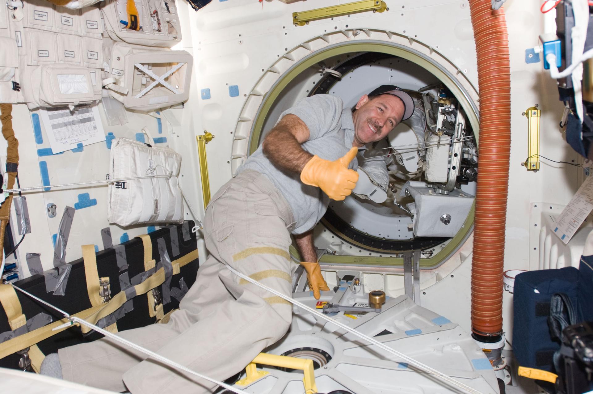 S125-E-007789 (15 May 2009) --- Astronaut John Grunsfeld signals "thumbs up" to indicate two of his crewmates coming inside from a lengthy space walk are "home." Grunsfeld had just opened the hatch that leads from the mid deck to the airlock. Completing this day's session of extravehicular activity and in the airlock when this photo was made were astronauts Mike Massimino and Michael Good.