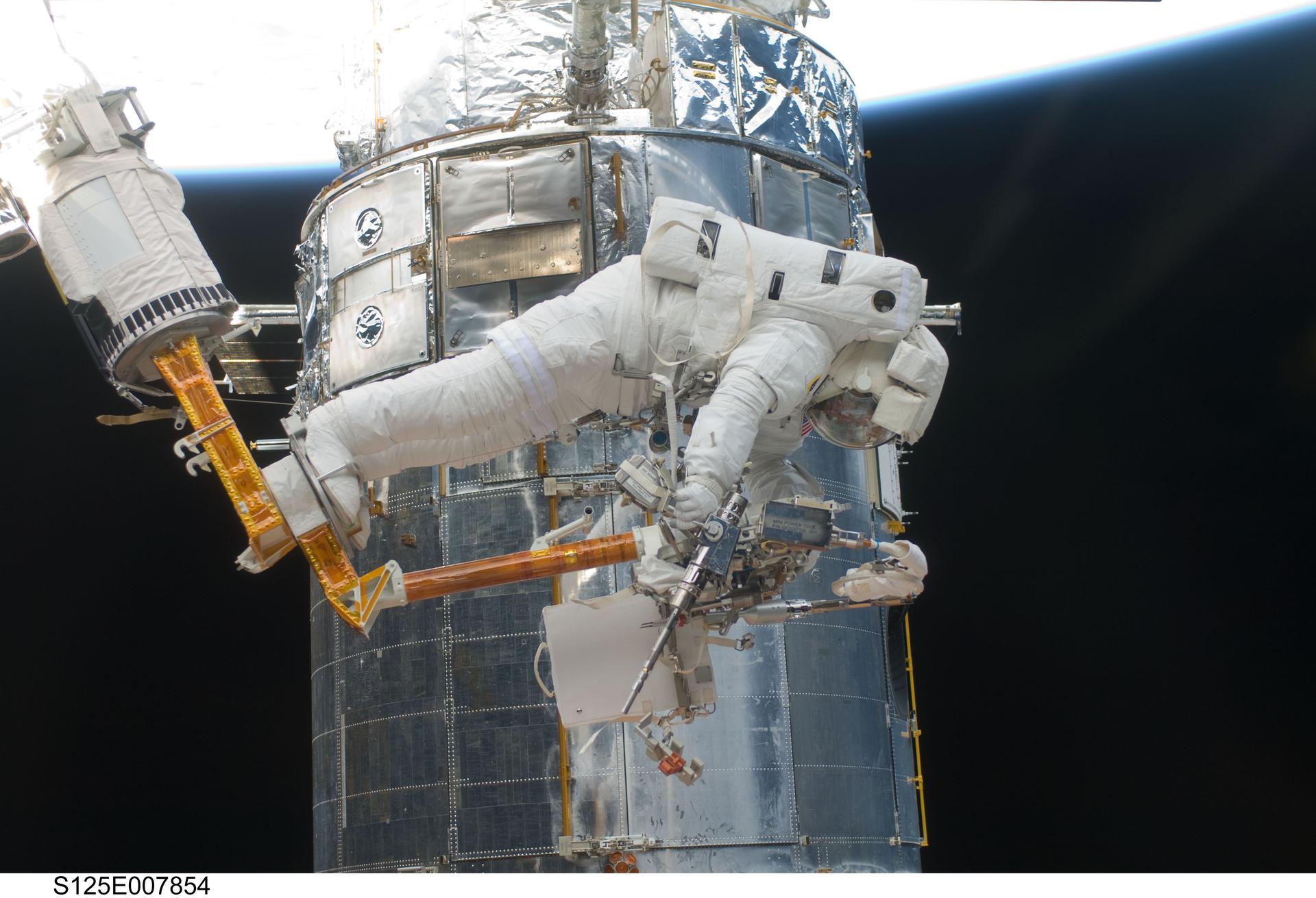 S125-E-007854 (16 May 2009) --- Astronaut Andrew Feustel, STS-125 mission specialist, retrieves a power tool as he navigates near the Hubble Space Telescope on the end of the remote manipulator system arm, controlled from inside Atlantis? crew cabin. Astronauts Feustel and John Grunsfeld were continuing servicing work on the giant observatory, locked down in the cargo bay of the shuttle.
