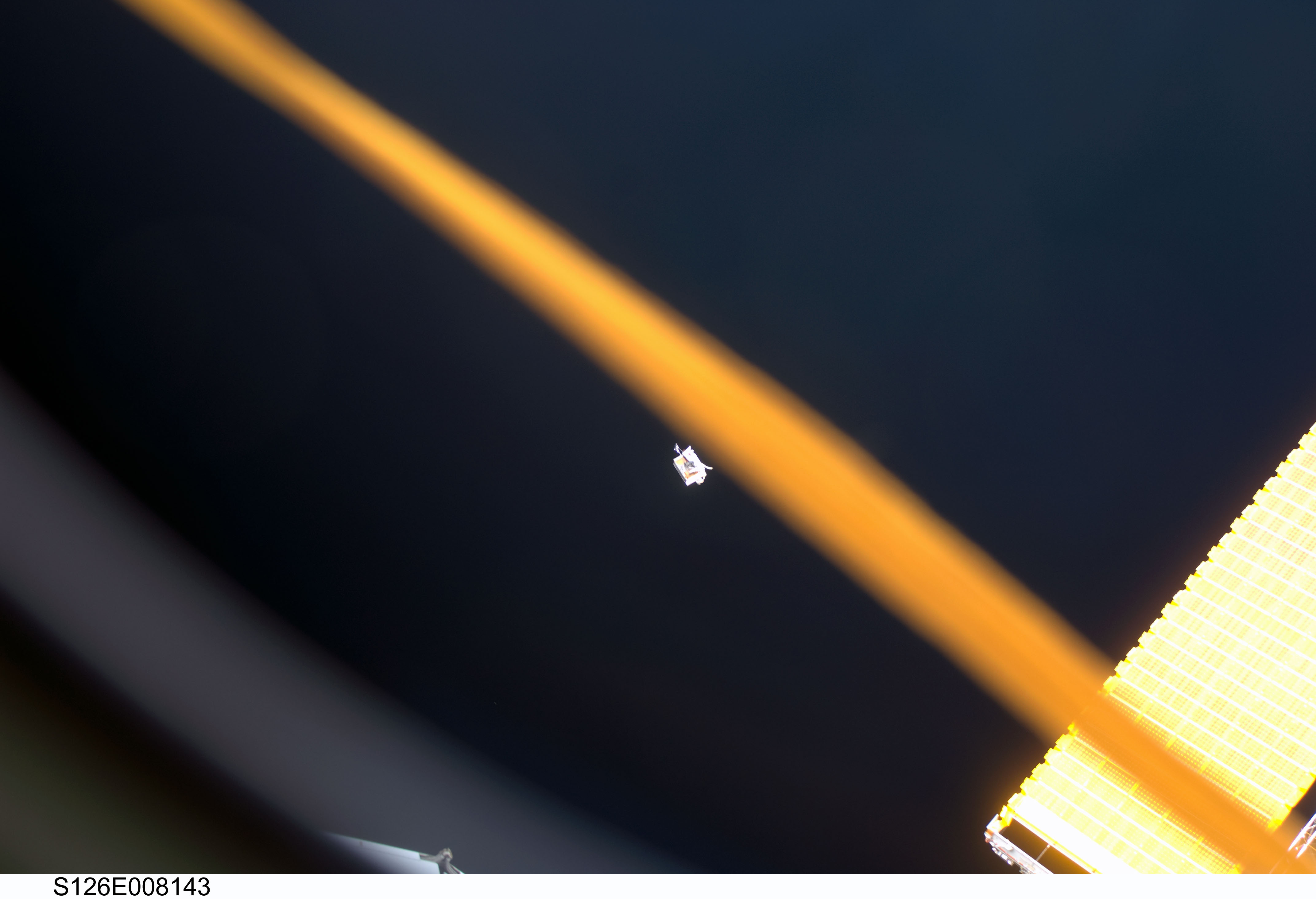 S126-E-008143 (18 Nov. 2008) --- An extravehicular activity (EVA) tool bag drifts away from the International Space Station during the mission's first scheduled spacewalk for STS-126. About halfway into the spacewalk, one of the grease guns that astronaut Heidemarie Stefanyshyn-Piper (out of frame), mission specialist, was preparing to use on the Solar Alpha Rotary Joint released some Braycote grease into her crew lock bag, which is the tool bag the spacewalkers use during their activities. As she was cleaning the inside of the bag, it drifted away from her and toward the aft and starboard portion of the International Space Station. Inside the bag were two grease guns, a scraper, a scraper debris container, several wipes in a caddy and tethers.