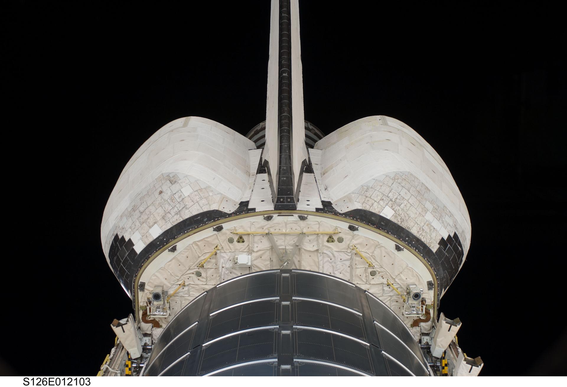 S126-E-012103 (27 Nov. 2008) --- --- Backdropped against the blackness of space, the aft portion of the Space Shuttle Endeavour, with the multi-purpose logistics module Leonardo in stow mode, was captured in a series of photographs by one of the STS-126 crewmembers on Nov. 27, Thanksgiving day, also the eve of departure from the International Space Station on Nov. 28.