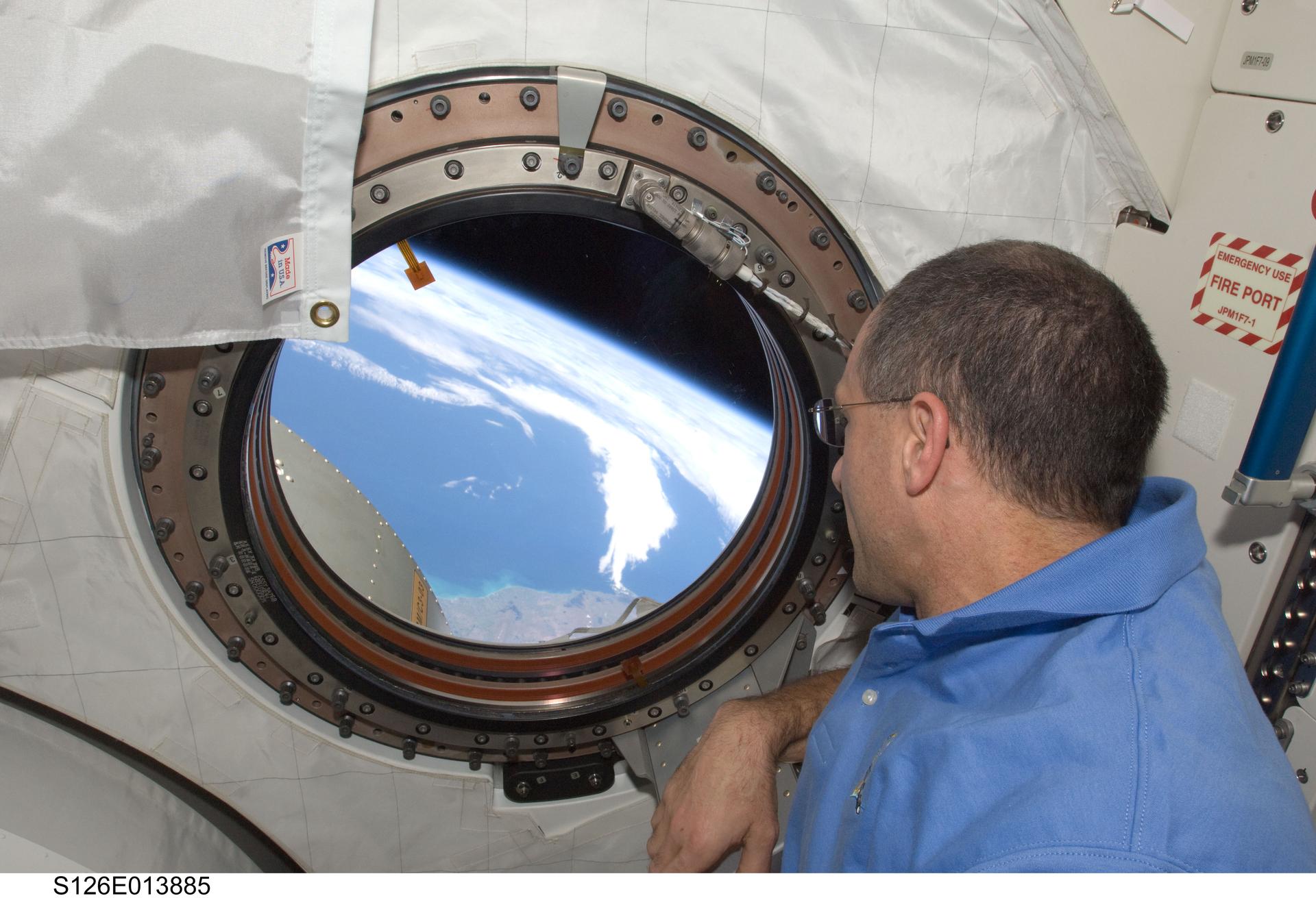 S126-E-013885 (27 Nov. 2008) --- Astronaut Donald Pettit, STS-126 mission specialist, looks at the home planet from a window inside the Kibo laboratory on Thanksgiving Day. The brownish land in the foreground that Pettit is looking at is the southwest portion of the South Island of New Zealand and covers the coastal area between the cities of Timaru (north or left side of the image) and Dunedin on Sawyers Bay (south or right hand side of the photo). The white is cloud cover over the ocean. One more day remains for the Space Shuttle Endeavour to be docked with the station.