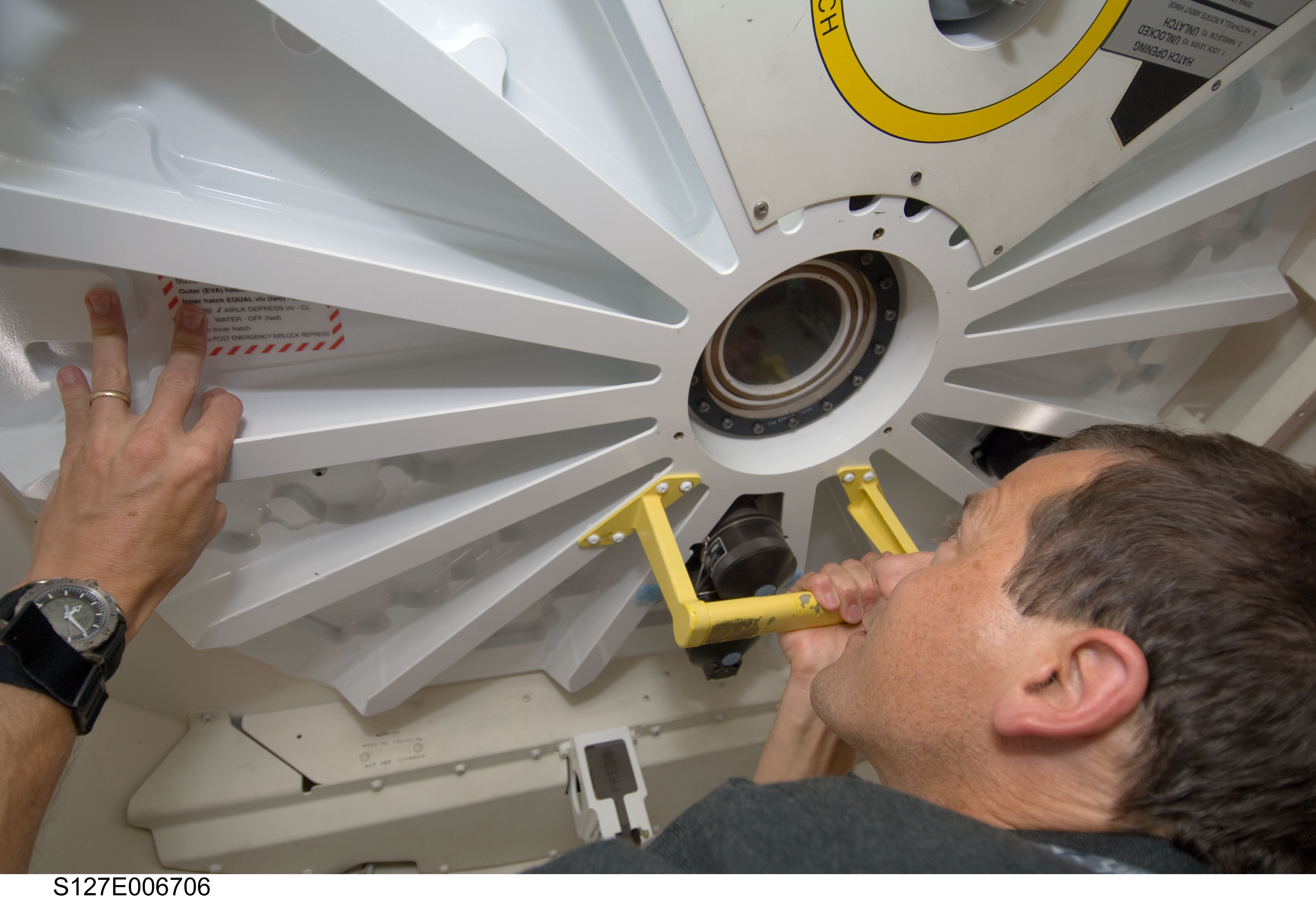S127-E-006706 (17 July 2009) --- Astronaut Tom Marshburn, STS-127 mission specialist, peers through a window in the hatch that separates seven Endeavour crewmembers from six International Space Station inhabitants. But the separation wasn't for long, as soon afterward the hatch was opened and the visitors from Earth moved onto the station to set the population record at 13. More importantly, over a week's worth of joint activities lies ahead for the two crews.